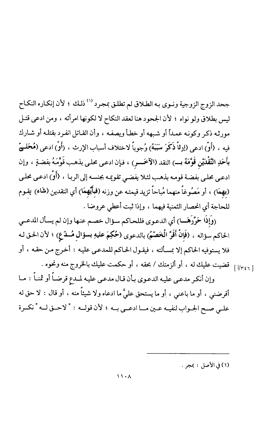 جحد الزوج الزوجية ونوى به الطلاق لم تطلق بمجرد (¬1) ذلك؛ لأن إنكاره النكاح ليس بطلاق ولو نواه؛ لأن الجحود هنا لعقد النكاح لا لكونها امرأته، ومن ادعى قتل مورثه ذكر وكونه عمدًا أو شبهه أو خطأ ويصفه، وأن القاتل انفرد بقتله أو شارك فيه، (أَوْ) ادعى (إرثًا ذَكَرَ سَبَبَهُ) وُجوبًا لاختلاف أسباب الإرث، (أَوْ) ادعى (مُحَلى بأَحَدِ النَّقْدَيْنِ قَوَّمَهُ بـ) النقد (الآخَرِ)، فإن ادعى محلى بذهب قَوَّمَهُ بفضةٍ، وإن ادعى محلى بفضة قومه بذهب لئلا يفضي تقويمه بجنسه إلى الربا، (أَوْ) ادعى محلى (بِهِمَا)، أو مَصُوغًا منهما مُبُاحًا تزيد قيمته عن وزنه (فبِأَيِّهِمَا) أي النقدين (شَاء) يقوم للحاجة أي انحصار الثمنية فيهما، وإذا ثبت أعطي عروضا.