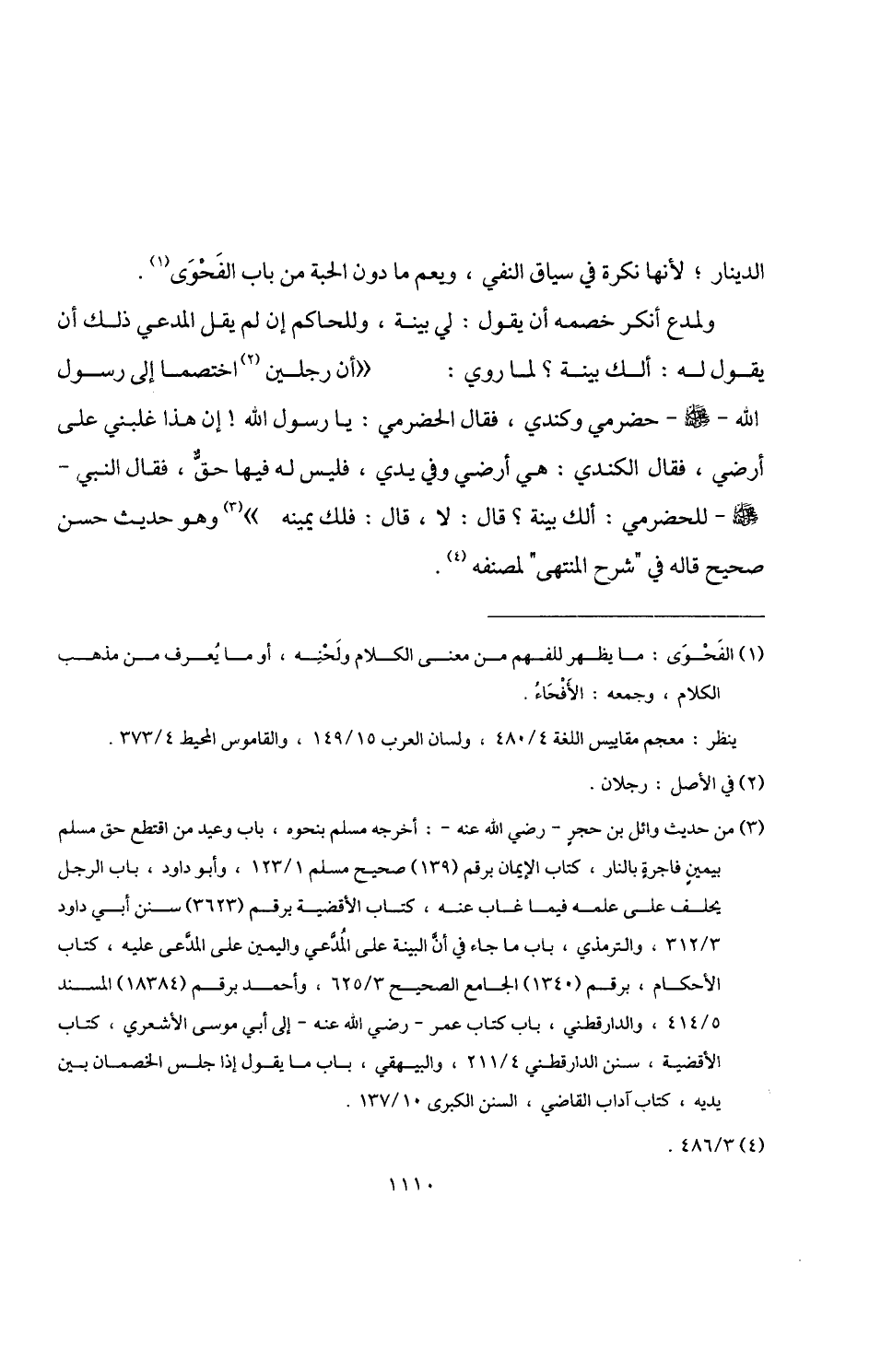 (¬3) من حديث وائل بن حجر -رضي اللَّه عنه-: أخرجه مسلم بنحوه، باب وعيد من اقتطع حق مسلم بيمينٍ فاجرةٍ بالنار، كتاب الإيمان برقم (139) صحيح مسلم 1/ 123، وأبو داود، باب الرجل يحلف على علمه فيما غاب عنه، كتاب الأقضية برقم (3623) سنن أبي داود 3/ 312، والترمذي، باب ما جاء في أن البينة على المُدَّعي واليمين على المدَّعى عليه، كتاب الأحكام، برقم (1340) الجامع الصحيح 3/ 625، وأحمد برقم (18384) المسند 5/ 414، والدارقطني، باب كتاب عمر -رضي اللَّه عنه- إلى أبي موسى الأشعري، كتاب الأقضية، سنن الدارقطني 4/ 211، والبيهقي، باب ما يقول إذا جلس الخصمان بين يديه، كتاب آداب القاضي، السنن الكبرى 10/ 137.