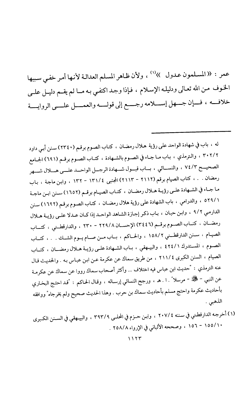 = له، باب في شهادة الواحد على رؤية هلال رمضان، كتاب الصوم برقم (2340) سنن أبي داود 2/ 302، والترمذي، باب ما جاء في الصوم بالشهادة، كتاب الصوم برقم (691) الجامع الصحيح 3/ 74، والنسائي، باب قبول شهادة الرجل الواحد على هلال شهر رمضان. .، كتاب الصيام برقم (2112 - 2113) المجتبى 4/ 131 - 132، وابن ماجة، باب ما جاء في الشهادة على رؤية هلال رمضان، كتاب الصيام برقم (1652) سنن ابن ماجة 1/ 529، والدرامي، باب الشهادة على رؤية هلال رمضان، كتاب الصوم برقم (1692) سنن الدارمي 2/ 9، وابن حبان، باب ذكر إجازة الشاهد الواحد إذا كان عدلا على رؤية هلال رمضان، كتاب الصوم برقم (3446) الإحسان 8/ 229 - 235، والدارقطني، كتاب الصيام، سنن الدارقطني 2/ 158، والحاكم، باب من صام يوم الشك. .، كتاب الصوم، المستدرك 1/ 424، والبيهقي، باب الشهادة على رؤية هلال رمضان، كتاب الصيام، السنن الكبرى 4/ 211، من طريق سماك عن عكرمة عن ابن عباس به. والحديث قال عنه الترمذي: "حديث ابن عباس فيه اختلاف. . . وأكثر أصحاب سماك رووا عن سماك عن عكرمة عن النبي -صلى اللَّه عليه وسلم- مرسلا". ا. هـ، ورجح النسائي إرساله، وقال الحاكم: "قد احتج البخاري بأحاديث عكرمة واحتج مسلم بأحاديث سماك بن حرب. وهذا الحديث صحيح ولم يخرجاه" ووافقه الذهبي.