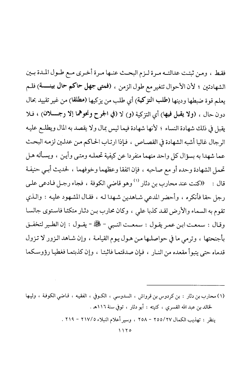 فقط، ومن ثبتت عدالته مرة لزم البحث عنها مرة أخرى مع طول المدة بين الشهادتين؛ لأن الأحوال تتغير مع طول الزمن، (فمتى جهل حاكم حال بينة) فلم يعلم قوة ضبطها ودينها (طلب التزكية) أي طلب من يزكيها (مطلقا) من غير تقييد. بحال دون حال، (ولا يقبل فيها) أي التزكية (و) لا (في الجرح ونحوهما إلا رجلان)، فلا يقبل في ذلك شهادة النساء؛ لأنها شهادة فيما ليس بمال ولا يقصد به المال ويطلع عليه الرجال غالبا أشبه الشهادة في القصاص، فإذا ارتاب الحاكم من عدلين لزمه البحث عما شهدا به بسؤال كل واحد منهما منفردا عن كيفية تحمله ومتى وأين، ويسأله هل تحمل الشهادة وحده أو مع صاحبه، فإن اتفقا وعظهما وخوفهما، لحديث أبي حنيفة قال: "كنت عند محارب بن دثار (¬1) وهو قاضي الكوفة، فجاء رجل فادعى على رجل حقا فأنكره، وأحضر الدعي شاهدين شهدا له، فقال المشهود عليه: والذي تقوم به السماء والأرض لقد كذبا علي، وكان محارب بن دثار متكئا فاستوى جالسا وقال: سمعت ابن عمر يقول: سمعت النبي -صلى اللَّه عليه وسلم- يقول: إن الطير لتخفق بأجنحتها، وترمي ما في حواصلها من هول يوم القيامة، وإن شاهد الزور لا تزول قدماه حتى يتبوأ مقعده من النار، فإن صدقتما فاثبتا، وإن كذبتما فغطيا رؤوسكما
