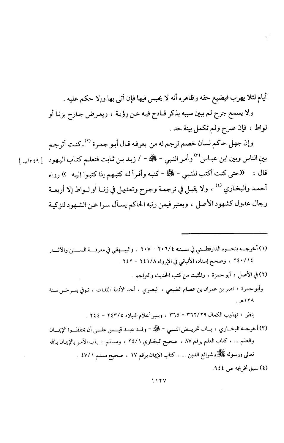 وإن جهل حاكم لسان خصم ترجم له من يعرفه قال أبو جمرة (¬1) -كنت أترجم بين الناس وبين ابن عباس (¬2) وأمر النبي -صلى اللَّه عليه وسلم- زيد بن ثابت فتعلم كتاب اليهود قال: "حتى كنت أكتب للنبي -صلى اللَّه عليه وسلم- كتبه وأقرأ له كتبهم إذا كتبوا إليه" رواه أحمد والبخاري (¬3)، ولا يقبل في ترجمة وجرح وتعديل في زنا أو لواط إلا أربعة رجال عدول كشهود الأصل، ويعتبر فيمن رتبه الحاكم يسأل سرا عن الشهود لتزكية