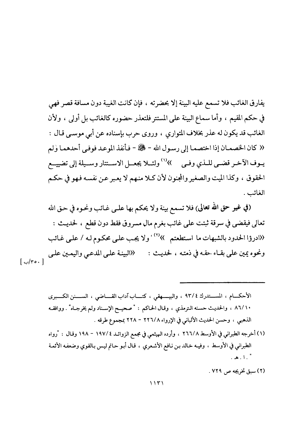 (في غير حق اللَّه تعالى) فلا تسمع بينة ولا يحكم بها على غائب ونحوه في حق اللَّه تعالى فيقضى في سرقة ثبتت على غائب بغرم مال مسروق فقط دون قطع، لحديث: "ادرؤا الحدود بالشبهات ما استطعتم" (¬2)، ولا يجب على محكوم له على غائب ونحوه يمين على بقاء حقه في ذمته، لحديث: "البينة على المدعي واليمين على