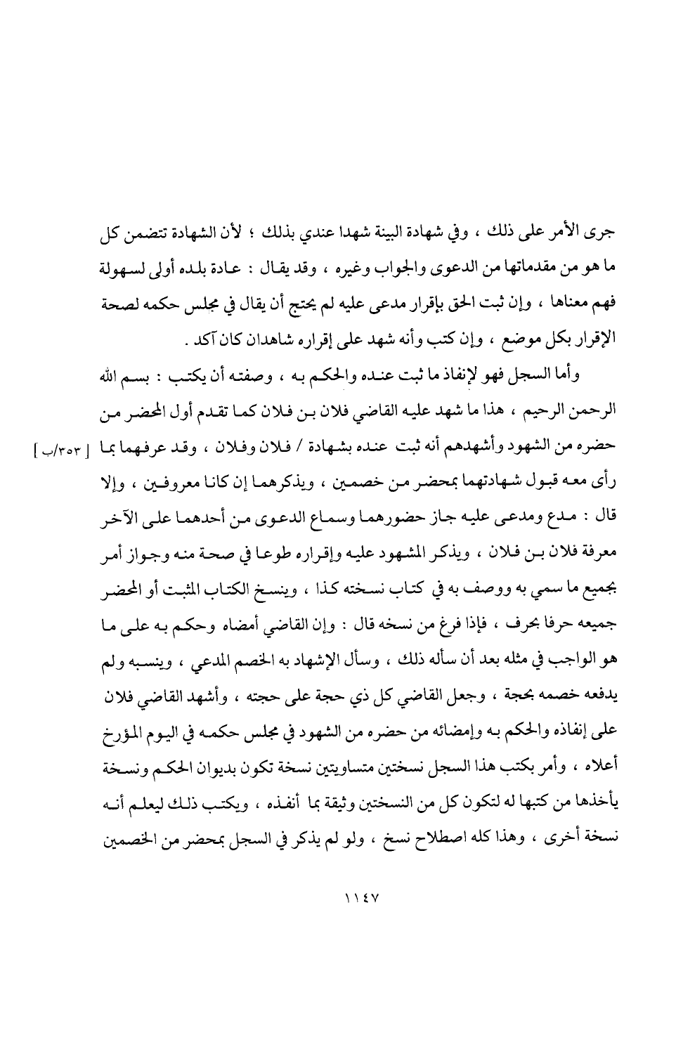 وأما السجل فهو لإنفاذ ما ثبت عنده والحكم به، وصفته أن يكتب: بسم اللَّه الرحمن الرحيم، هذا ما شهد عليه القاضي فلان بن فلان كما تقدم أول المحضر من حضره من الشهود وأشهدهم أنه ثبت عنده بشهادة فلان وفلان، وقد عرفهما بما رأى معه قبول شهادتهما بمحضر من خصمين، ويذكرهما إن كانا معروفين، وإلا قال: مدع ومدعى عليه جاز حضورهما وسماع الدعوى من أحدهما على الآخر معرفة فلان بن فلان، ويذكر المشهود عليه وإقراره طوعا في صحة منه وجواز أمر بجميع ما سمي به ووصف به في كتاب نسخته كذا، وينسخ الكتاب المثبت أو المحضر جميعه حرفا بحرف، فإذا فرغ من نسخه قال: وإن القاضي أمضاه وحكم به على ما هو الواجب في مثله بعد أن سأله ذلك، وسأل الإشهاد به الخصم المدعي، وينسبه ولم يدفعه خصمه بحجة، وجعل القاضي كل ذي حجة على حجته، وأشهد القاضي فلان على إنفاذه والحكم به وإمضائه من حضره من الشهود في مجلس حكمه في اليوم المؤرخ أعلاه، وأمر بكتب هذا السجل نسختين متساويتين نسخة تكون بديوان الحكم ونسخة يأخذها من كتبها له لتكون كل من النسختين وثيقة بما أنفذه، ويكتب ذلك ليعلم أنه نسخة أخرى، وهذا كله اصطلاح نسخ، ولو لم يذكر في السجل بمحضر من الخصمين