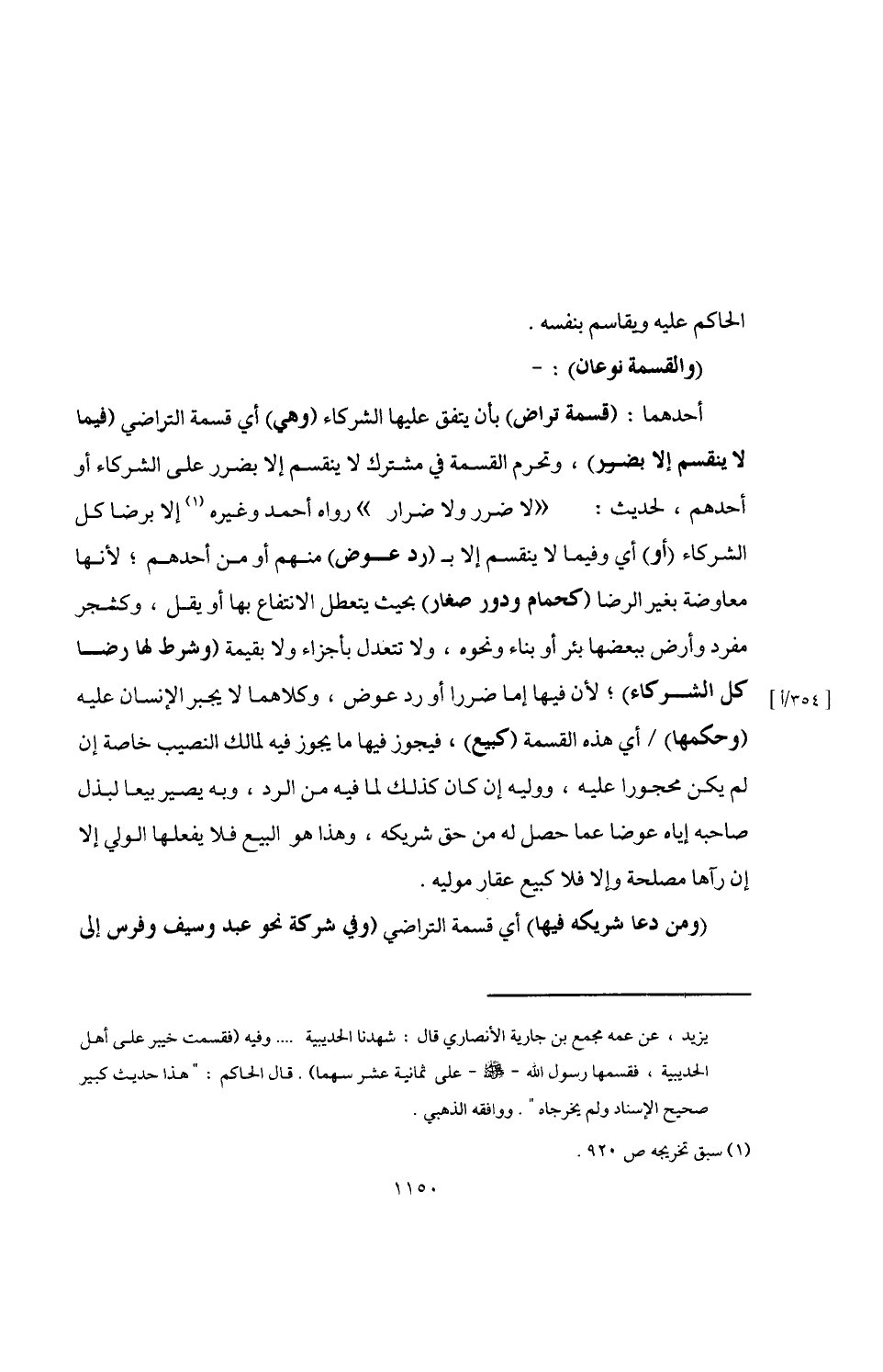 أحدهما: (قسمة تراض) بأن يتفق عليها الشركاء (وهي) أي قسمة التراضي (فيما لا ينقسم إلا بضرر)، وتحرم القسمة في مشترك لا ينقسم إلا بضرر على الشركاء أو أحدهم، لحديث: "لا ضرر ولا ضرار" رواه أحمد وغيره (¬1) إلا برضا كل الشركاء (أو) أي وفيما لا ينقسم إلا بـ (رد عوض) منهم أو من أحدهم؛ لأنها معاوضة بغير الرضا (كحمام ودور صغار) بحيث يتعطل الانتفاع بها أو يقل، وكشجر مفرد وأرض ببعضها بئر أو بناء ونحوه، ولا تتعدل بأجزاء ولا بقيمة (وشرط لها رضا كل الشركاء)؛ لأن فيها إما ضررا أو رد عوض، وكلاهما لا يجبر الإنسان كليه (وحكمها) أي هذه القسمة (كبيع)، فيجوز فيها ما يجوز فيه لمالك النصيب خاصة إن لم يكن محجورا كليه، ووليه إن كان كذلك لما فيه من الرد، وبه يصير بيعا لبذل صاحبه إياه عوضا عما حصل له من حق شريكه، وهذا هو البيع فلا يفعلها الولي إلا إن رآها مصلحة وإلا فلا كبيع عقار موليه.