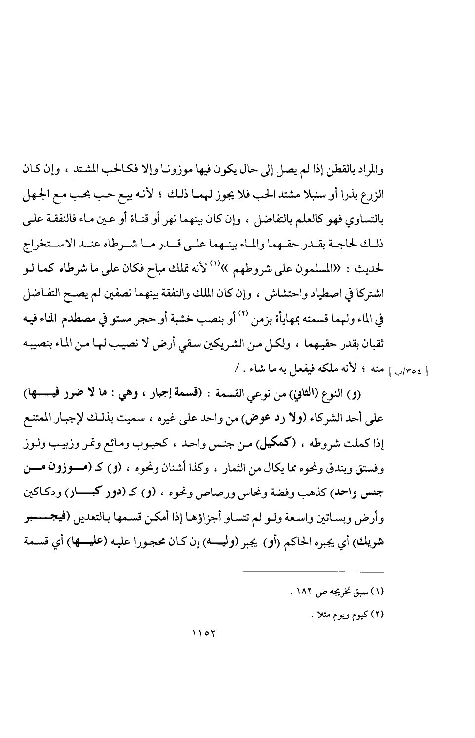 (و) النوع (الثاني) من نوعي القسمة: (قسمة إجبار، وهي: ما لا ضرر فيها) عمى أحد الشركاء (ولا رد عوض) من واحد على غيره، سميت بذلك لإجبار الممتنع إذا كملت شروطه، (كمكيل) من جنس واحد، كحبوب ومائع وتمر وزبيب ولوز وفستق وبندق ونحوه مما يكال من الثمار، وكذا أشنان ونحوه، (و) كـ (موزون من جنس واحد) كذهب وفضة ونحاس ورصاص ونحوه، (و) كـ (دور كبار) ودكاكين وأرض وبساتين واسعة ولو لم تتساو أجزاؤها إذا أمكن قسمها بالتعديل (فيجبر شريك) أي يجبره الحاكم (أو) يجبر (وليه) إن كان محجورا عليه (عليها) أي قسمة