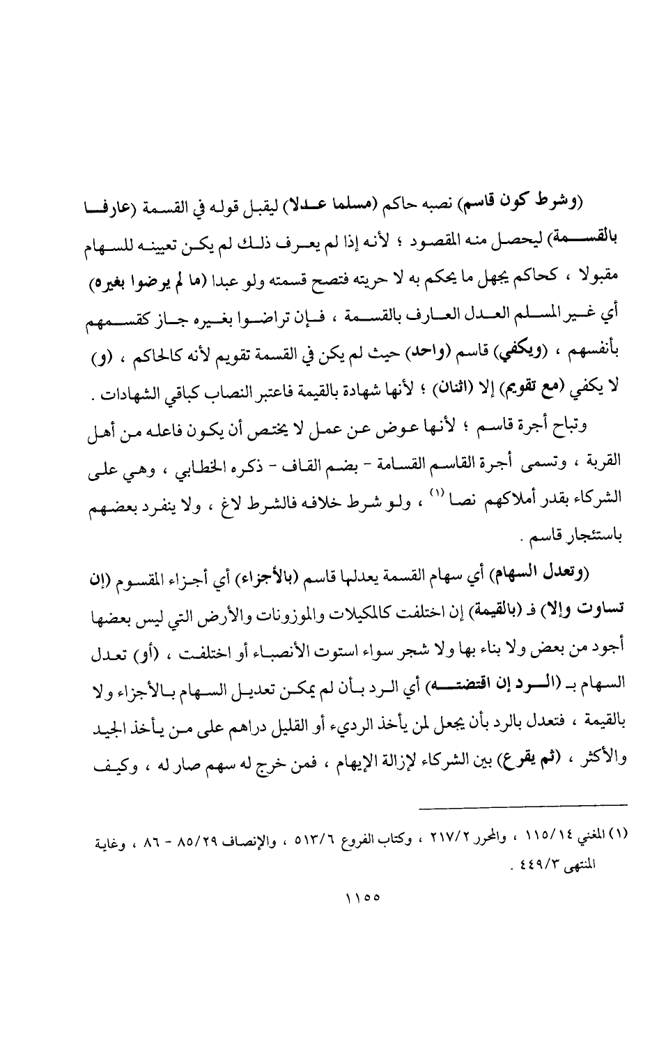 (وشرط كون قاسم) نصبه حاكم (مسلما عدلا) ليقبل قوله في القسمة (عارفا بالقسمة) ليحصل منه المقصود؛ لأنه إذا لم يعرف ذلك لم يكن تعيينه للسهام مقبولا، كحاكم يجهل ما يحكم به لا حريته فتصح قسمته ولو عبدا (ما لم يرضوا بغيره) أي غير المسلم العدل العارف بالقسمة، فإن تراضوا بغيره جاز كقسمهم بأنفسهم، (ويكفي) قاسم (واحد) حيث لم يكن في القسمة تقويم لأنه كالحاكم، (و) لا يكفي (مع تقويم) إلا (اثنان)؛ لأنها شهادة بالقيمة فاعتبر النصاب كباقي الشهادات.