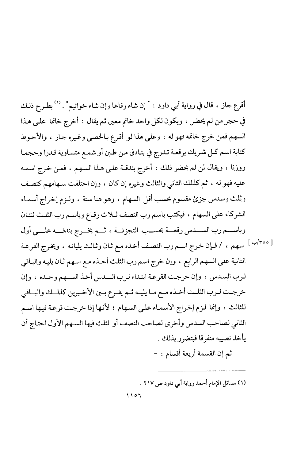 أقرع جاز، قال في رواية أبي داود: "إن شاء رقاعا وإن شاء خواتيم". (¬1) يطرح ذلك في حجر من لم يحضر، ويكون لكل واحد خاتم معين ثم يقال: أخرج خاتما على هذا السهم فمن خرج خاتمه فهو له، وعلى هذا لو أقرع بالحصى وغيره جاز، والأحوط كتابة اسم كل شريك برقعة تدرج في بنادق من طين أو شمع متساوية قدرا وحجما ووزنا، ويقال لمن لم يحضر ذلك: أخرج بندقة على هذا السهم، فمن خرج اسمه عليه فهو له، ثم كذلك الثاني والثالث وغيره إن كان، وإن اختلفت سهامهم كنصف وثلث وسدس جزئ مقسوم بحسب أقل السهام، وهو هنا ستة، ولزم إخراج أسماء الشركاء على السهام، فيكتب باسم رب النصف ثلاث رقاع وباسم رب الثلث ثنتان وباسم رب السدس رقعة بحسب التجزئة، ثم يخرج بندقة على أول سهم، فإن خرج اسم رب النصف أخذه مع ثان وثالث يليانه، ويخرج القرعة الثانية على السهم الرابع، وإن خرج اسم رب الثلث أخذه مع سهم ثان يليه والباقي لرب السدس، وإن خرجت القرعة ابتداء لرب السدس أخذ السهم وحده، وإن خرجت لرب الثلث أخذه مع ما يليه ثم يقرع بين الأخيرين كذلك والباقي للثالث، وإنما لزم إخراج الأسماء على السهام؛ لأنها إذا خرجت قرعة فيها اسم الثاني لصاحب السدس وأخرى لصاحب النصف أو الثلث فيها السهم الأول احتاج أن يأخذ نصيبه متفرقا فيتضرر بذلك.