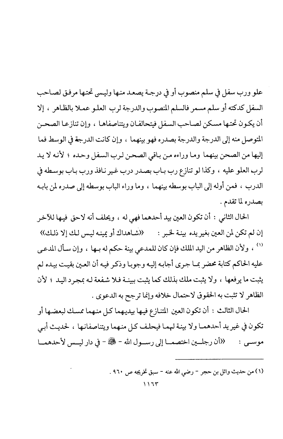 الحال الثالث: أن تكون العين المتنازع فيها بيديهما كل منهما ممسك لبعضها أو تكون في غير يد أحدهما ولا بينة لهما فيحلف كل منهما ويتناصفانها، لحديث أبي موسى: "أن رجلين اختصما إلى رسول اللَّه -صلى اللَّه عليه وسلم- في دار ليس لأحدهما