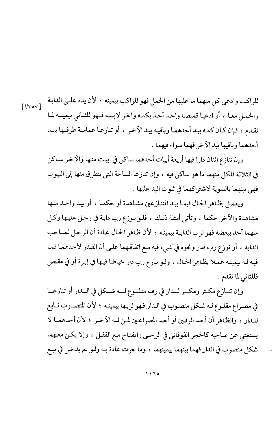 ويعمل بظاهر الحال فيما بيد المتنازعين مشاهدة أو حكما، أو بيد واحد منها مشاهدة والآخر حكما، وتأتي أمثلة ذلك، فلو نوزع رب دابة في رحل عليها وكل منهما آخذ ببعضه فهو لرب الدابة بيمينه؛ لأن ظاهر الحال عادة أن الرحل لصاحب الدابة، أو نوزع رب قدر ونحوه في شيء فيه مع اتفاقهما على أن القدر لأحدهما فما فيه له بيمينه عملا بظاهر الحال، ولو نازع رب دار خياطا فيها في إبرة أو في مقص فللثاني لما تقدم.