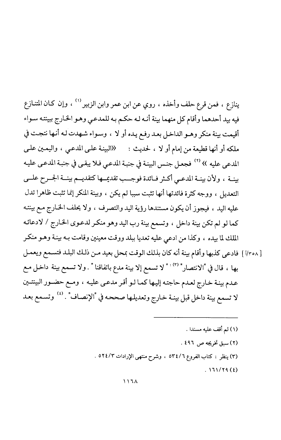 ينازع، فمن قرع حلف وأخذه، روي عن ابن عمر وابن الزبير (¬1)، وإن كان المتنازع فيه بيد أحدهما وأقام كل منهما بينة أنه له حكم به للمدعي وهو الخارج ببينته سواء أقيمت بينة منكر وهو الداخل بعد رفع يده أو لا، وسواء شهدت له أنها نتجت في ملكه أو أنها مطيعة من إمام أو لا، لحديث: "البينة على المدعي، واليمين على المدعى عليه" (¬2) فجعل جنس البينة في جنبة المدعي فلا يبقى في جنبة المدعى عليه بينة، ولأن بينة المدعي أكثر فائدة فوجب تقديمها كتقديم بينة الجرح على التعديل، ووجه كثرة فائدتها أنها تثبت سببا لم يكن، وبينة المنكر إنما تثبت ظاهرا تدل عليه اليد، فيجوز أن يكون مستندها رؤية اليد والتصرف، ولا يحلف الخارج مع بينته كما لو لم تكن بينة داخل، وتسمع بينة رب اليد وهو منكر لدعوى الخارج لادعائه الملك لما بيده، وكذا من ادعي عليه تعديا ببلد ووقت معينين وقامت به بينة وهو منكر فادعى كذبها وأقام بينة أنه كان بذلك الوقت بمحل بعيد من ذلك البلد فتسمع ويعمل بها، قال في "الانتصار" (¬3): "لا تسمع إلا بينة مدع باتفاقنا". ولا تسمع بينة داخل مع عدم بينة خارج لعدم حاجته إليها كما لو أقر مدعى عليه، ومع حضور البينتين لا تسمع بينة داخل قبل بينة خارج وتعديلها صححه في "الإنصاف". (¬4) وتسمع بعد