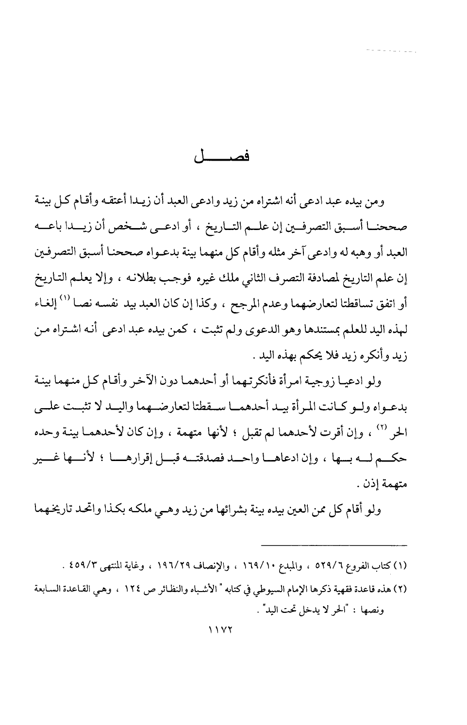 ومن بيده عبد ادعى أنه اشتراه من زيد وادعى العبد أن زيدا أعتقه وأقام كل بينة صححنا أسبق التصرفين إن علم التاريخ، أو ادعى شخص أن زيدا باعه العبد أو وهبه له وادعى آخر مثله وأقام كل منهما بينة بدعواه صححنا أسبق التصرفين إن علم التاريخ لمصادفة التصرف الثاني ملك غيره فوجب بطلانه، وإلا يعلم التاريخ أو اتفق تساقطتا لتعارضهما وعدم المرجح، وكذا إن كان العبد بيد نفسه نصا (¬1) إلغاء لهذه اليد للعلم بمستندها وهو الدعوى ولم تثبت، كمن بيده عبد ادعى أنه اشتراه من زيد وأنكره زيد فلا يحكم بهذه اليد.