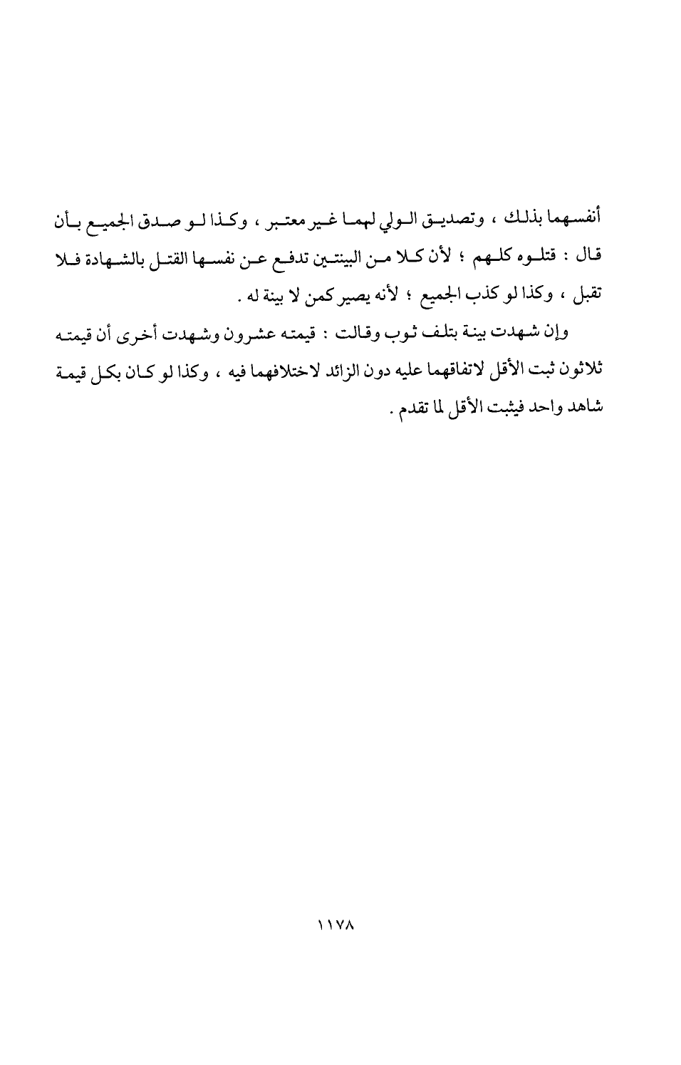 وإن شهدت بينة بتلف ثوب وقالت: قيمته عشرون وشهدت أخرف أن قيمته ثلاثون ثبت الأقل لاتفاقهما عليه دون الزائد لاختلافهما فيه، وكذا لو كان بكل قيمة شاهد واحد فيثبت الأقل لما تقدم.