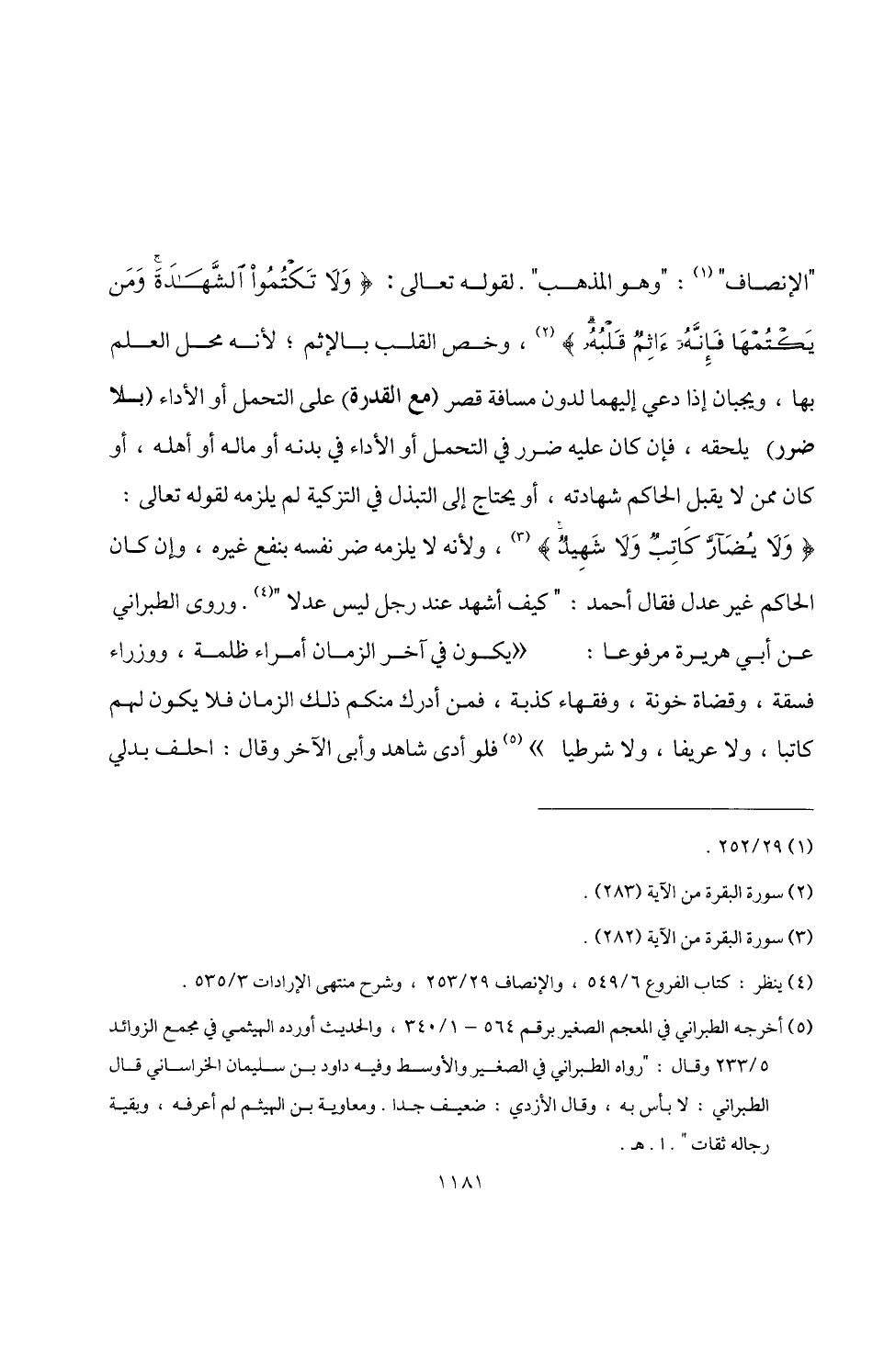 "الإنصاف" (¬1): "وهو المذهب". لقوله تعالى: {وَلَا تَكْتُمُوا الشَّهَادَةَ وَمَنْ يَكْتُمْهَا فَإِنَّهُ آثِمٌ قَلْبُهُ} (¬2)، وخص القلب بالإثم؛ لأنه محل العلم بها، ويجبان إذا دعي إليهما لدون مسافة قصر (مع القدرة) على التحمل أو الأداء (بلا ضرر) يلحقه، فإن كان عليه ضرر في التحمل أو الأداء في بدنه أو ماله أو أهله، أو كان ممن لا يقبل الحاكم شهادته، أو يحتاج إلى التبذل في التزكية لم يلزمه لقوله تعالى: {وَلَا يُضَارَّ كَاتِبٌ وَلَا شَهِيدٌ} (¬3)، ولأنه لا يلزمه ضر نفسه بنفع غيره، وإن كان الحاكم غير عدل فقال أحمد: "كيف أشهد عند رجل ليس عدلا" (¬4). وروى الطبراني عن أبي هريرة مرفوعا: "يكون في آخر الزمان أمراء ظلمة، ووزراء فسقة، وقضاة خونة، وفقهاء كذبة، فمن أدرك منكم ذلك الزمان فلا يكون لهم كاتبا، ولا عريفا، ولا شرطيا" (¬5) فلو أدى شاهد وأبى الآخر وقال: احلف بدلي