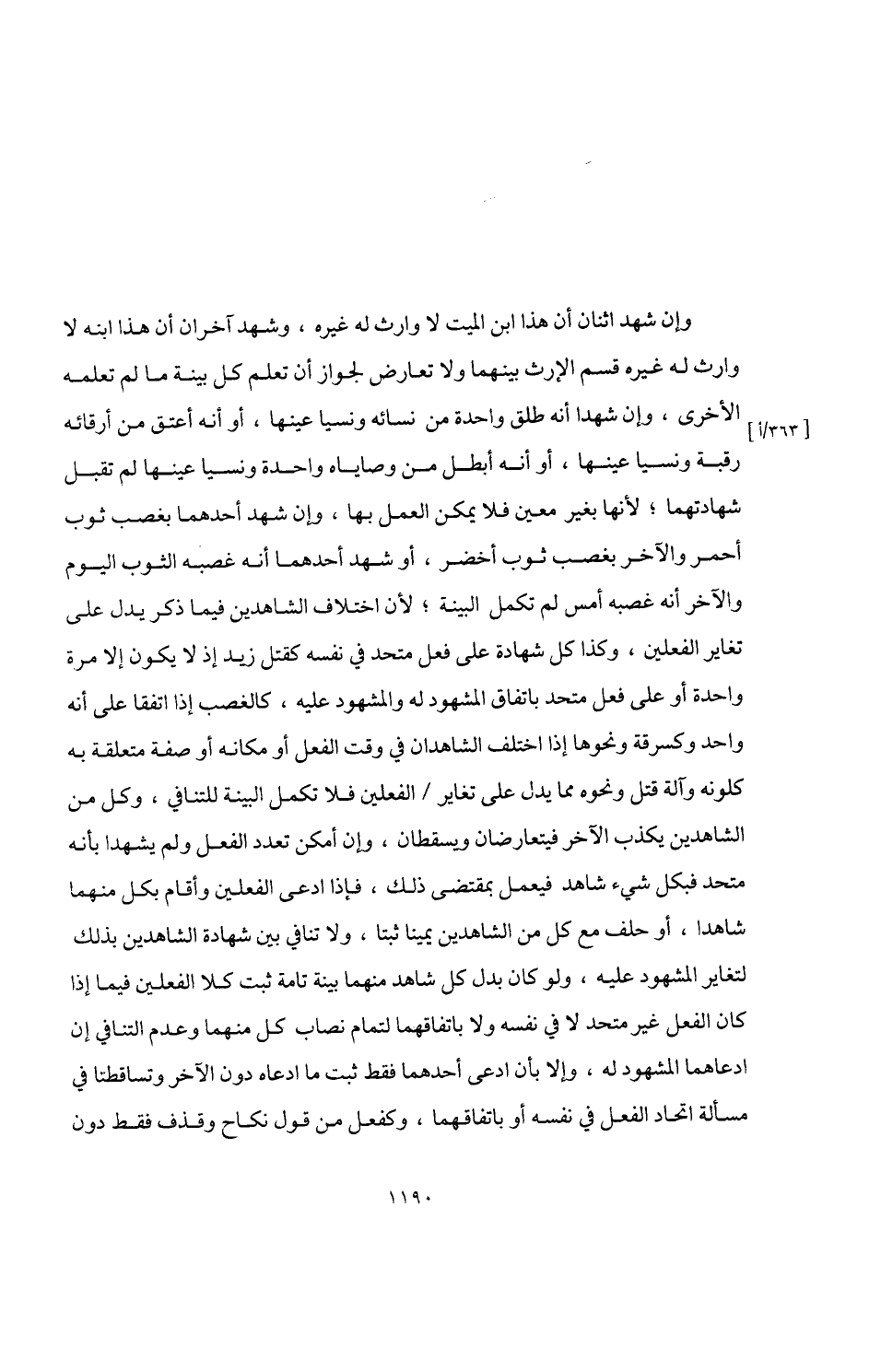 وإن شهد اثنان أن هذا ابن الميت لا وارث له غيره، وشهد آخران أن هذا ابنه لا وارث له غيره قسم الإرث بينهما ولا تعارض لجواز أن تعلم كل بينة ما لم تعلمه الأخرى، وإن شهدا أنه طلق واحدة من نسائه ونسيا عينها، أو أنه أعتق من أرقائه رقبة ونسيا عينها، أو أنه أبطل من وصاياه واحدة ونسيا عينها لم تقبل شهادتهما؛ لأنها بغير معين فلا يمكن العمل بها، وإن شهد أحدهما بغصب ثوب أحمر والآخر بغصب ثوب أخضر، أو شهد أحدهما أنه غصبه الثوب اليوم والآخر أنه غصبه أمس لم تكمل البينة؛ لأن اختلاف الشاهدين فيما ذكر يدل على تغاير الفعلين، وكذا كل شهادة على فعل متحد في نفسه كقتل زيد إذ لا يكون إلا مرة واحدة أو على فعل متحد باتفاق المشهود له والمشهود عليه، كالغصب إذا اتفقا على أنه واحد وكسرقة ونحوها إذا اختلف الشاهدان في وقت الفعل أو مكانه أو صفة متعلقة به كلونه وآلة قتل ونحوه مما يدل على تغاير الفعلين فلا تكمل البينة للتنافي، وكل من الشاهدين يكذب الآخر فيتعارضان ويسقطان، وإن أمكن تعدد الفعل ولم يشهدا بأنه متحد فبكل شيء شاهد فيعمل بمقتضى ذلك، فإذا ادعى الفعلين وأقام بكل منهما شاهدا، أو حلف مع كل من الشاهدين يمينا ثبتا، ولا تنافي بين شهادة الشاهدين بذلك لتغاير المشهود عليه، ولو كان بدل كل شاهد منهما بينة تامة ثبت كلا الفعلين فيما إذا كان الفعل غير متحد لا في نفسه ولا باتفاقهما لتمام نصاب كل منهما وعدم التنافي إن ادعاهما المشهود له، والا بأن ادعى أحدهما فقط ثبت ما ادعاه دون الآخر وتساقطتا في مسألة اتحاد الفعل في نفسه أو باتفاقهما، وكفعل من قول نكاح وقذف فقط دون