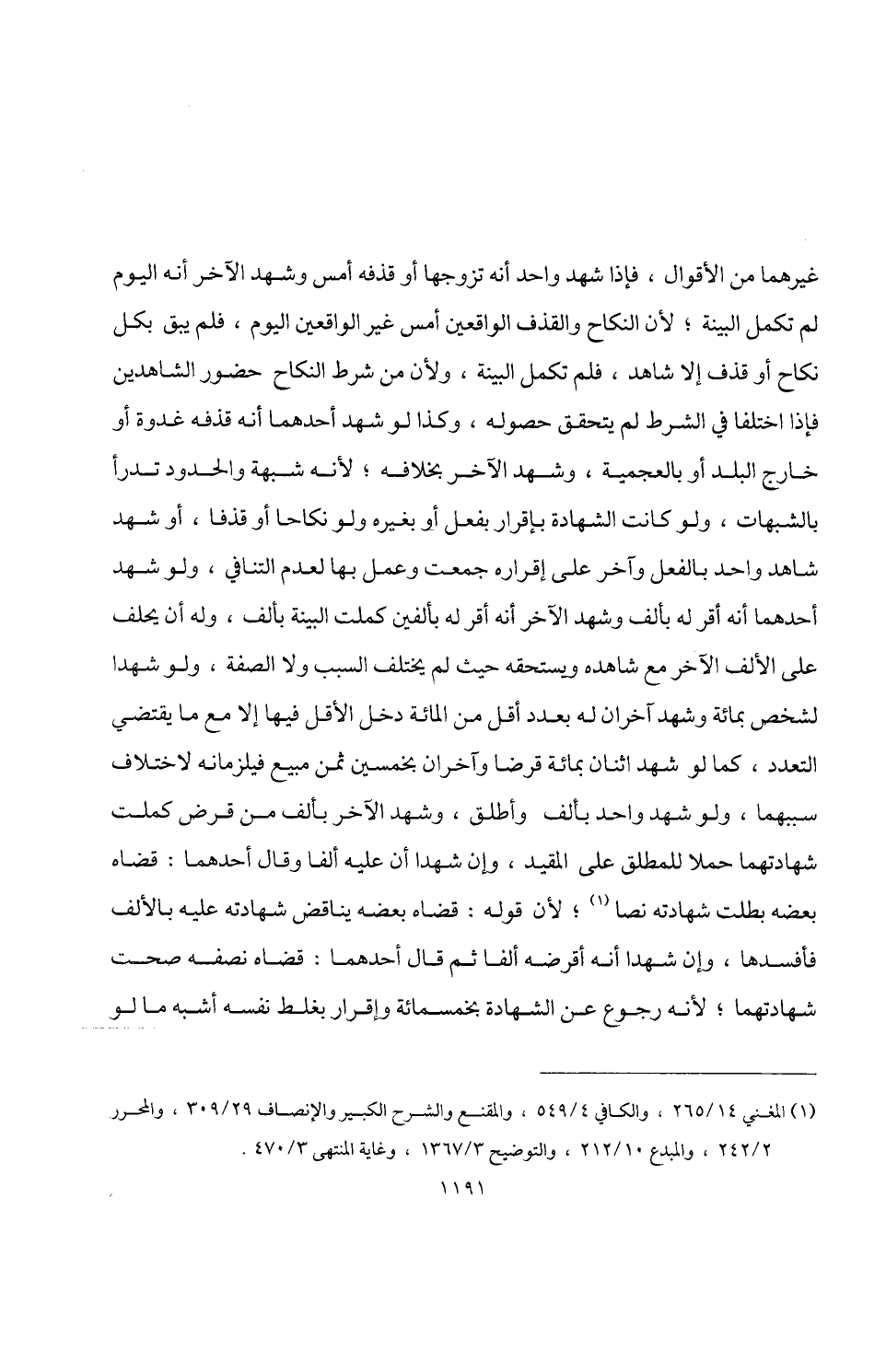 غيرهما من الأقوال، فإذا شهد واحد أنه تزوجها أو قذفه أمس وشهد الآخر أنه اليوم لم تكمل البينة؛ لأن النكاح والقذف الواقعين أمس غير الواقعين اليوم، فلم يبق بكل نكاح أو قذف إلا شاهد، فلم تكمل البينة، ولأن من شرط النكاح حضور الشاهدين فإذا اختلفا في الشرط لم يتحقق حصوله، وكذا لو شهد أحدهما أنه قذفه غدوة أو خارج البلد أو بالعجمية، وشهد الآخر بخلافه؛ لأنه شبهة والحدود تدرأ بالشبهات، ولو كانت الشهادة بإقرار بفعل أو بغيره ولو نكاحا أو قذفا، أو شهد شاهد واحد بالفعل وآخر على إقراره جمعت وعمل بها لعدم التنافي، ولو شهد أحدهما أنه أقر له بألف وشهد الآخر أنه أقر له بألفين كملت البينة بألف، وله أن يحلف على الألف الآخر مع شاهده ويستحقه حيث لم يختلف السبب ولا الصفة، ولو شهدا لشخص بمائة وشهد آخران له بعدد أقل من المائة دخل الأقل فيها إلا مع ما يقتضي التعدد، كما لو شهد اثنان بمائة قرضا وآخران بخمسين ثمن مبيع فيلزمانه لاختلاف سببهما، ولو شهد واحد بألف وأطلق، وشهد الآخر بألف من قرض كملت شهادتهما حصلا للمطلق على المقيد، وإن شهدا أن عليه ألفا وقال أحدهما: قضاه بعضه بطلت شهادته نصا (¬1)؛ لأن قوله: قضاه بعضه يناقض شهادته عليه بالألف فأفسدها، وإن شهدا أنه أقرضه ألفا ثم قال أحدهما: قضاه نصفه صحت شهادتهما؛ لأنه رجوع عن الشهادة بخمسمائة وإقرار بغلط نفسه أشبه ما لو