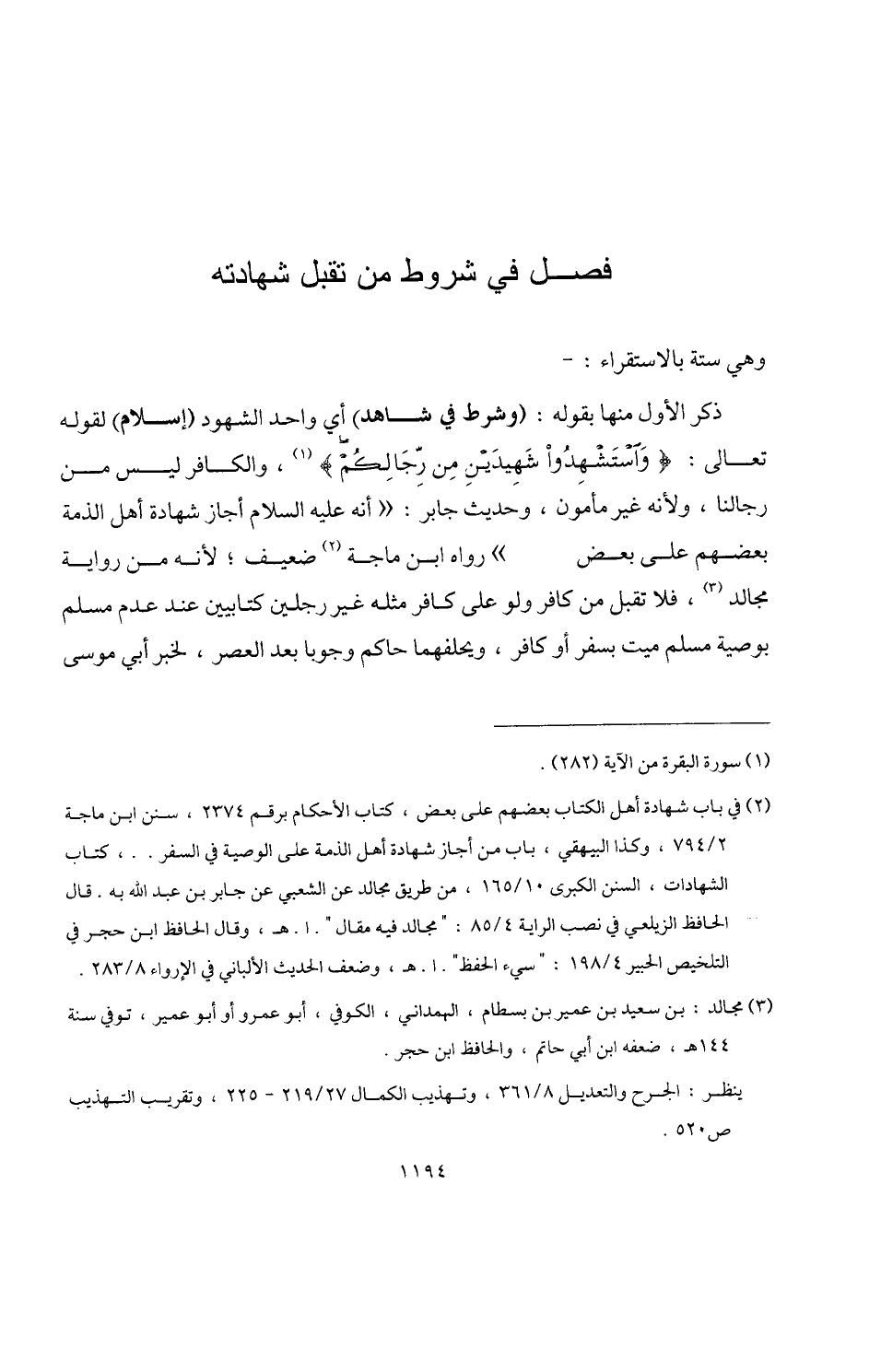 (¬2) في باب شهادة أهل الكتاب بعضهم على بعض، كتاب الأحكام برقم 2374، سنن ابن ماجة 2/ 794، وكذا البيهقي، باب من أجاز شهادة أهل الذمة على الوصية في السفر. .، كتاب الشهادات، السنن الكبرى 10/ 165، من طريق مجالد عن الشعبي عن جابر بن عبد اللَّه به. قال الحافظ الزيلعي في نصب الراية 4/ 85: "مجالد فيه مقال". ا. هـ، وقال الحافظ ابن حجر في التلخيص الحبير 4/ 198: "سيء الحفظ". ا. هـ، وضعف الحديث الألباني في الإرواء 8/ 283.
