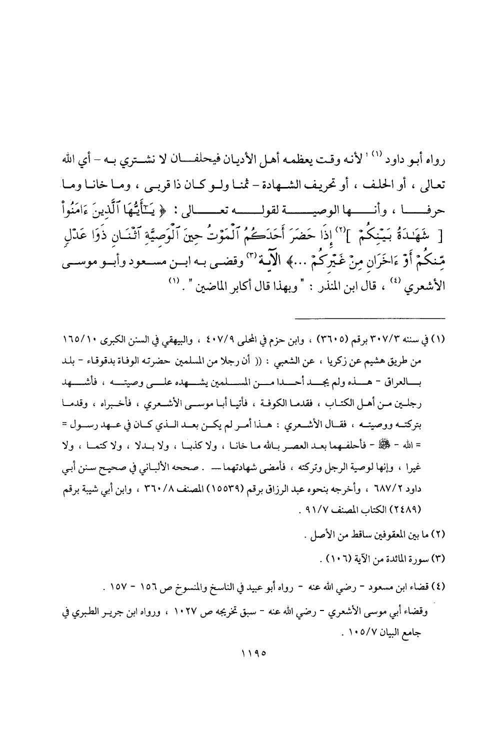 (¬1) في سننه 7/ 303 برقم (3605)، وابن حزم في المحلى 9/ 407، والبيهقي في السنن الكبرى 10/ 165 من طريق هشيم عن زكريا، عن الشعبي: "أن رجلا من المسلمين حضرته الوفاة بدقوقاء -بلد بالعراق- هذه ولم يجد أحدا من المسلمين يشهده على وصيته، فأشهد رجلين من أهل الكتاب، فقدما الكوفة، فأتيا أبا موسى الأشعري، فأخبراه، وقدما بتركته ووصيته، فقال الأشعري: هذا أمر لم يكن بعد الذي كان في عهد رسول اللَّه -صلى اللَّه عليه وسلم- فأحلفهما بعد العصر باللَّه ما خانا، ولا كذبا، ولا بدلا، ولا كتما، ولا غيرا، وإنها لوصية الرجل وتركته، فأمضى شهادتهما-. صححه الألباني في صحيح سنن أبي داود 2/ 687، وأخرجه بنحوه عبد الرزاق برقم (15539) المصنف 8/ 360، وابن أبي شيبة برقم (2489) الكتاب المصنف 7/ 91.