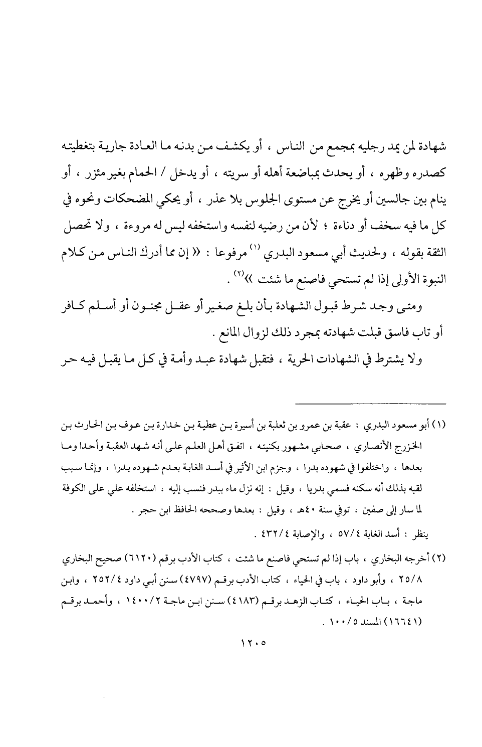 شهادة لمن يمد رجليه بمجمع من الناس، أو يكشف من بدنه ما العادة جارية بتغطيته كصدره وظهره، أو يحدث بمباضعة أهله أو سريته، أو يدخل الحمام بغير مئزر، أو ينام بين جالسين أو يخرج عن مستوى الجلوس بلا عذر، أو يحكي المضحكات ونحوه في كل ما فيه سخف أو دناءة؛ لأن من رضيه لنفسه واستخفه ليس له مروءة، ولا تحصل الثقة بقوله، ولحديث أبي مسعود البدري (¬1) مرفوعا: "إن مما أدرك الناس من كلام النبوة الأولى إذا لم تستحي فاصنع ما شئت" (¬2).