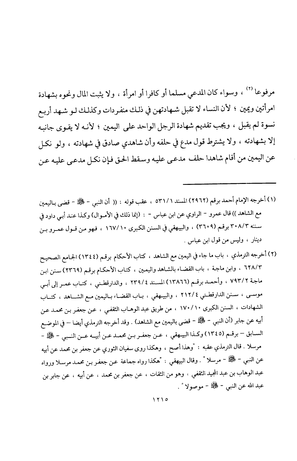 (¬1) أخرجه الترمذي، باب ما جاء في اليمين مع الشاهد، كتاب الأحكام برقم (1344) الجامع الصحيح 3/ 628، وابن ماجة، باب القضاء بالشاهد واليمين، كتاب الأحكام برقم (2369) سنن ابن ماجة 2/ 793، وأحمد برقم (13866) المسند 4/ 239، والدارقطني، كتاب عمر إلى أبي موسى، سنن الدارقطني 4/ 212، والبيهقي، باب القضاء باليمين مع الشاهد، كتاب الشهادات، السنن الكبرى 10/ 170، من طريق عبد الوهاب الثقفي، عن جعفر بن محمد عن أبيه عن جابر (أن النبي -صلى اللَّه عليه وسلم- قضى باليمين مع الشاهد). وقد أخرجه الترمذي أيضا -في الموضع السابق- برقم (1345) وكذا البيهقي، عن جعفر بن محمد عن أبيه عن النبي -صلى اللَّه عليه وسلم- مرسلا. قال الترمذي عقبه: "وهذا أصح، وهكذا روى سفيان الثوري عن جعفر بن محمد عن أبيه عن النبي -صلى اللَّه عليه وسلم- مرسلًا. وقال البيهقي: "هكذا رواه جماعة عن جعفر بن محمد مرسلا ورواه عبد الوهاب بن عبد المجيد الثقفي، وهو من الثقات، عن جعفر بن محمد، عن أبيه، عن جابر بن عبد اللَّه عن النبي -صلى اللَّه عليه وسلم- موصولا".