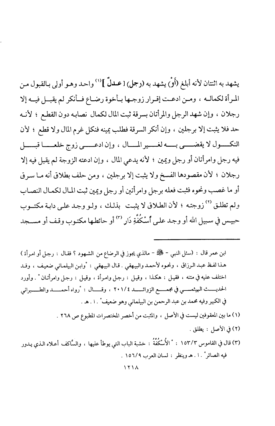 يشهد به اثنتان لأنه أبلغ (أَوْ) يشهد به (رجل [عدلٌ] (¬1) واحد وهو أولى بالقبول من المرأة لكماله، ومن ادعت إقرار زوجها بأخوة رضاع فأنكر لم يقبل فيه إلا رجلان، وإن شهد الرجل والمرأتان بسرقة ثبت المال لكمال نصابه دون القطع؛ لأنه حد فلا يثبت إلا برجلين، وإن أنكر السرقة فطلب يمينه فنكل غرم المال ولا قطع؛ لأن النكول لا يقضى به لغير المال، وإن ادعى زوج خلعا قبل فيه رجل وامرأتان أو رجل ويمين؛ لأنه يدعي المال، وإن ادعته الزوجة لم يقبل فيه إلا رجلان؛ لأن مقصودها الفسخ ولا يثبت إلا برجلين، ومن حلف بطلاق أنه ما سرق أو ما غصب ونحوه فثبت فعله برجل وامرأتين أو رجل ويمين ثبت المال لكمال النصاب ولم تطلق (¬2) زوجته؛ لأن الطلاق لا يثبت بذلك، ولو وجد على دابة مكتوب حبيس في سبيل اللَّه أو وجد على أسْكُفَّةِ دَارٍ (¬3) أو حائطها مكتوب وقف أو مسجد