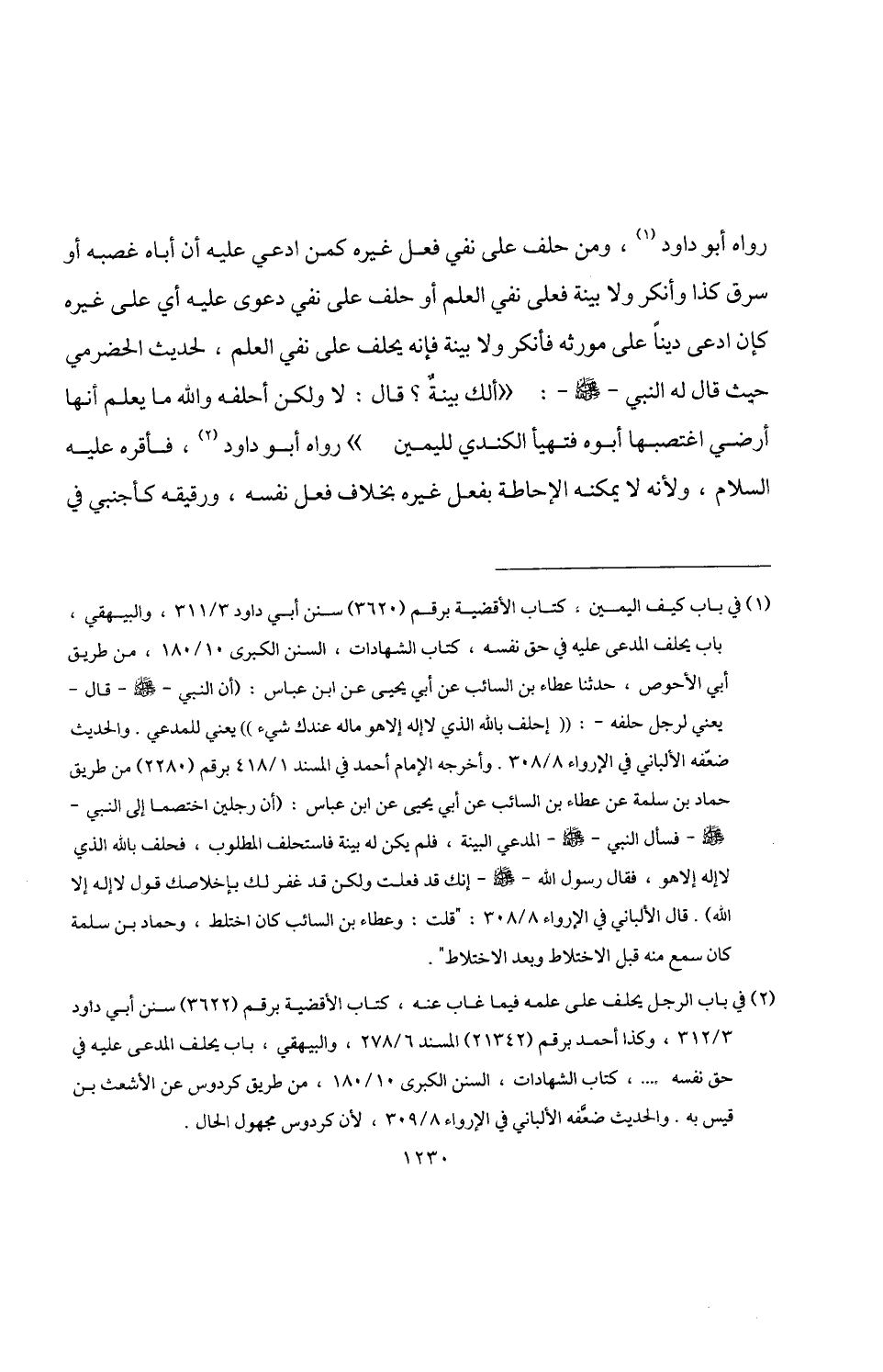 (¬1) في باب كيف اليمين، كتاب الأقضية برقم (3620) سنن أبي داود 3/ 311، والبيهقي، باب يحلف المدعى عليه في حق نفسه، كتاب الشهادات، السنن الكبرى 10/ 180، من طريق أبي الأحوص، حدثنا عطاء بن السائب عن أبي يحيى عن ابن عباس: (أن النبي -صلى اللَّه عليه وسلم- قال -يعني لرجل حلفه-: "إحلف باللَّه الذي لا إله إلاهو ماله عندك شيء" يعني للمدعي. والحديث ضعّفه الألباني في الإرواء 8/ 308. وأخرجه الإمام أحمد في المسند 1/ 418 برقم (2280) من طريق حماد بن سلمة عن عطاء بن السائب عن أبي يحيى عن ابن عباس: (أن رجلين اختصما إلى النبي -صلى اللَّه عليه وسلم- فسأل النبي -صلى اللَّه عليه وسلم- المدعي البينة، فلم يكن له بينة فاستحلف المطلوب، فحلف باللَّه الذي لا إله إلاهو، فقال رسول اللَّه -صلى اللَّه عليه وسلم- إنك قد فعلت ولكن قد غفر لك بإخلاصك قول لا إله إلا اللَّه). قال الألباني في الإرواء 8/ 308: "قلت: وعطاء بن السائب كان اختلط، وحماد بن سلمة كان سمع منه قبل الاخنلاط وبعد الاختلاط".