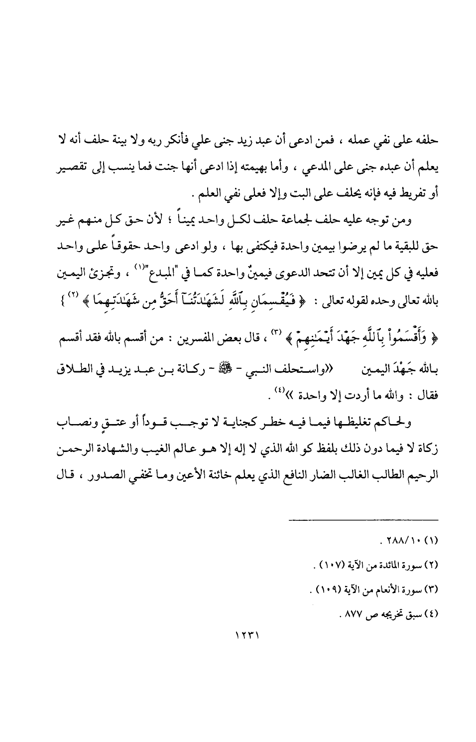 ومن توجه عليه حلف لجماعة حلف لكل واحد يمينًا؛ لأن حق كل منهم غير حق للبقية ما لم يرضوا بيمين واحدة فيكتفى بها، ولو ادعى واحد حقوقًا على واحد فعليه في كل يمين إلا أن تتحد الدعوى فيمينٌ واحدة كما في "المبدع" (¬1)، وتجزئ اليمين باللَّه تعالى وحده لقوله تعالى: {فَيُقْسِمَانِ بِاللَّهِ لَشَهَادَتُنَا أَحَقُّ مِنْ شَهَادَتِهِمَا} (¬2) {وَأَقْسَمُوا بِاللَّهِ جَهْدَ أَيْمَانِهِمْ} (¬3)، قال بعض المفسرين: من أقسم باللَّه فقد أقسم باللَّه جَهْدَ اليمين "واستحلف النبي -صلى اللَّه عليه وسلم- ركانة بن عبد يزيد في الطلاق فقال: واللَّه ما أردت إلا واحدة" (¬4).