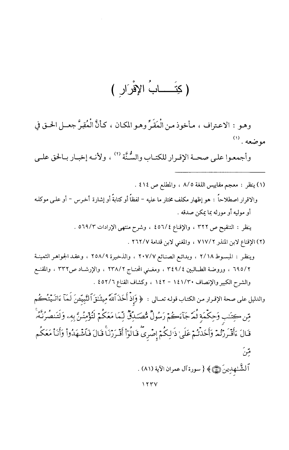 وهو: الاعتراف، مأخوذ من الْمَقَرِّ وهو المكان، كأنَّ الْمُقِرَّ جعل الحق في موضعه. (¬1)