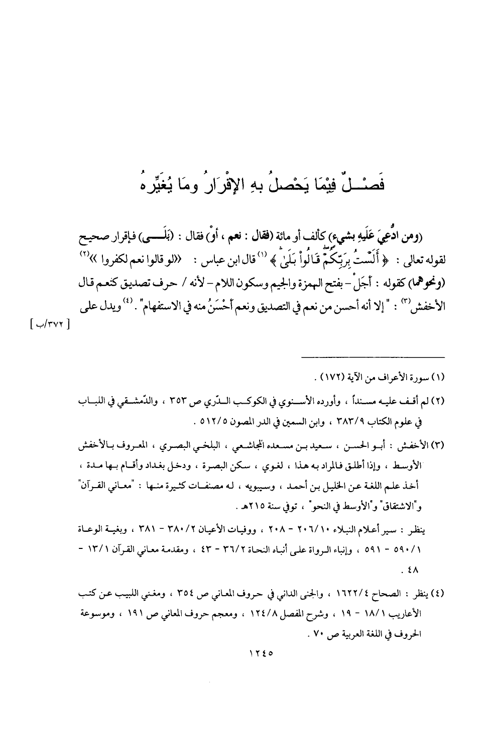 (¬3) الأخفش: أبو الحسن، سعيد بن مسعده المجاشعي، البلخي البصري، المعروف بالأخفش الأوسط, وإذا أطلق فالمراد به هذا، لغوي، سكن البصرة، ودخل بغداد وأقام بها مدة، أخذ علم اللغة عن الخليل بن أحمد، وسيبويه، له مصنفات كثيرة منها: "معاني القرآن" و"الاشتقاق" و"الأوسط في النحو"، توفي سنة 215 هـ.