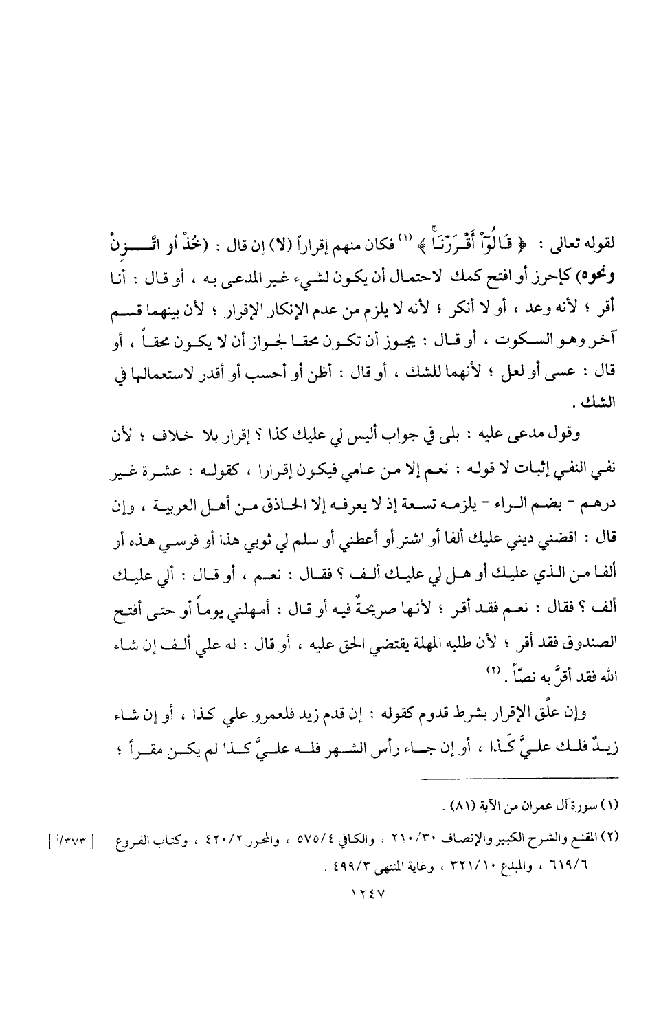 وقول مدعى عليه: بلى في جواب أليس لي عليك كذا؟ إقرار بلا خلاف؛ لأن نفي النفى إثبات لا قوله: نعيم إلا من عامي فيكون إقرارا، كقوله: عشرة غير درهم -بضم الراء- يلزمه تسعة إذ لا يعرفه إلا الحاذق من أهل العربية، وإن قال: اقضني ديني عليك ألفا أو اشتر أو أعطني أو سلم لي ثوبي هذا أو فرسي هذه أو ألفا من الذي عليك أو هل لي عليك ألف؟ فقال: نعم، أو قال: أبي علميك ألف؟ فقال: نعم فقد أقر؛ لأنها صريحةٌ فيه أو قال: أمهلني يومًا أو حتى أفتح الصندوق فقد أقر؛ لأن طلبه المهلة يقتضي الحق عليه، أو قال: له علي ألف إن شاء اللَّه فقد أقرَّ به نصًّا. (¬2)