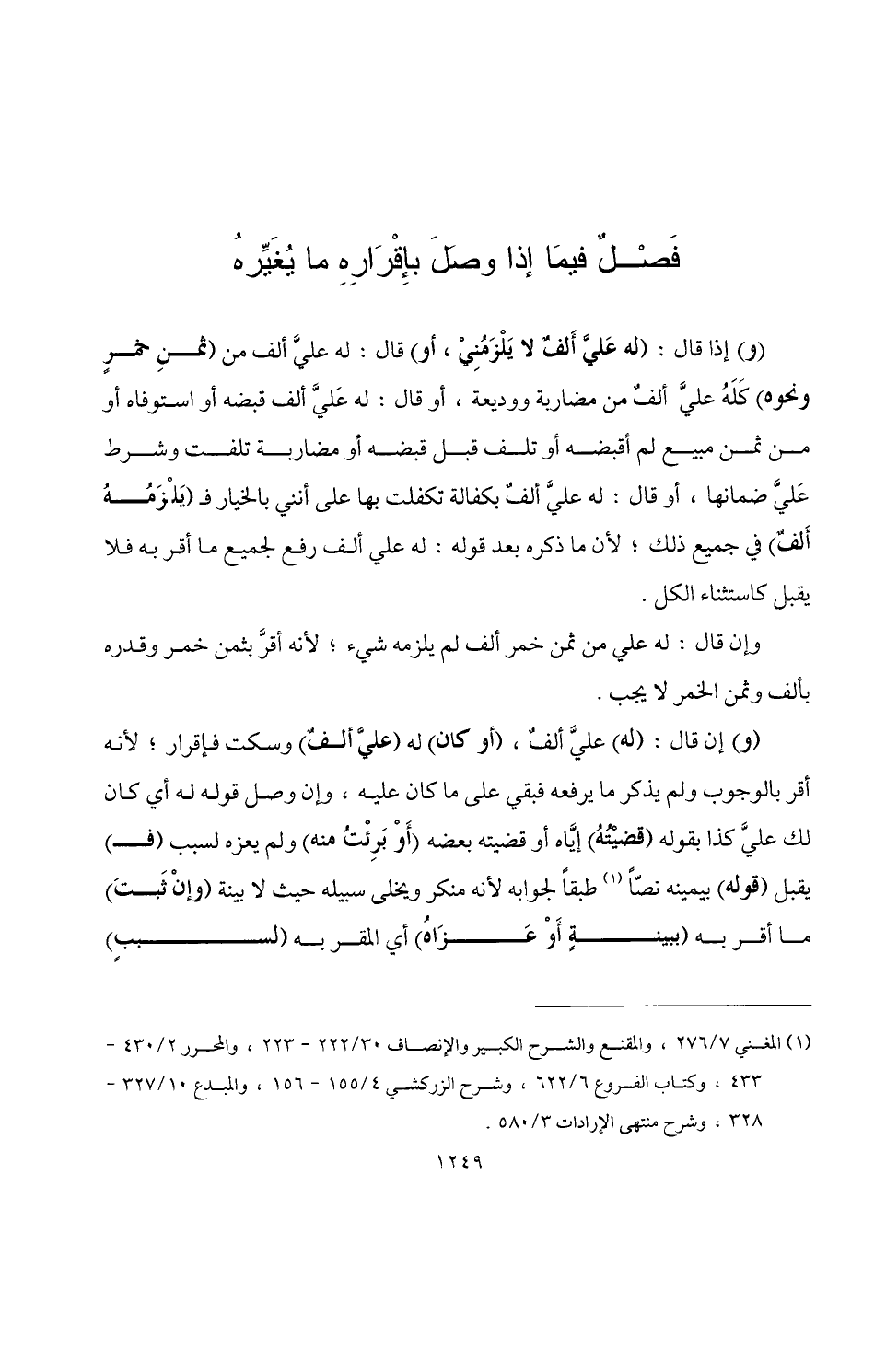 (و) إذا قال: (له عَليَّ أَلفٌ لا يَلْزَمُنِيْ، أو) قال: له عليَّ ألف من (ثمنِ خمرٍ ونحوه) كَلَهُ عليَّ ألفٌ من مضاربة ووديعة، أو قال: له عَليَّ ألف قبضه أو استوفاه أو من ثمن مبيع لم أقبضه أو تلف قبل قبضه أو مضاربة تلفت وشرط عَليَّ ضمانها، أو قال: له عليَّ ألفٌ بكفالة تكفلت بها على أنني بالخيار فـ (يَلزَمُه أَلفٌ) في جميع ذلك؛ لأن ما ذكره بعد قوله: له علي ألف رفع لجميع ما أقر به فلا يقبل كاستثناء الكل.