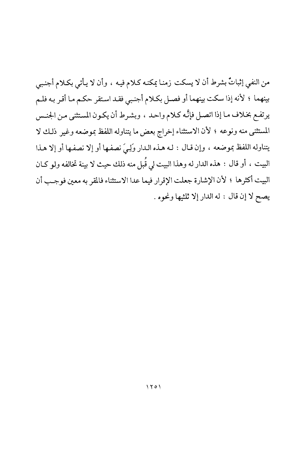 من النفي إثباتٌ بشرط أن لا يسكت زمنا يمكنه كلام فيه، وأن لا يأتي بكلام أجنبي بينهما؛ لأنه إذا سكت بينهما أو فصل بكلام أجنبي فقد استقر حكم ما أقر به فلم يرتفع بخلاف ما إذا اتصل فإنه كلام واحد، وبشرط أن يكون المستثنى من الجنس المستثنى منه ونوعه؛ لأن الاستثناء إخراج بعض ما يتناوله اللفظ بموضعه وغير ذلك لا يتناوله اللفظ بموضعه، وإن قال: له هذه الدار وَلِيَ نصفها أو إلا نصفها أو إلا هذا البيت، أو قال: هذه الدار له وهذا البيت لي قُبل منه ذلك حيث لا بينة تخالفه ولو كان البيت أكثرها؛ لأن الإشارة جعلت الإقرار فيما عدا الاستثناء فالمقر به معين فوجب أن يصح لا إن قال: له الدار إلا ثلثيها ونحوه.