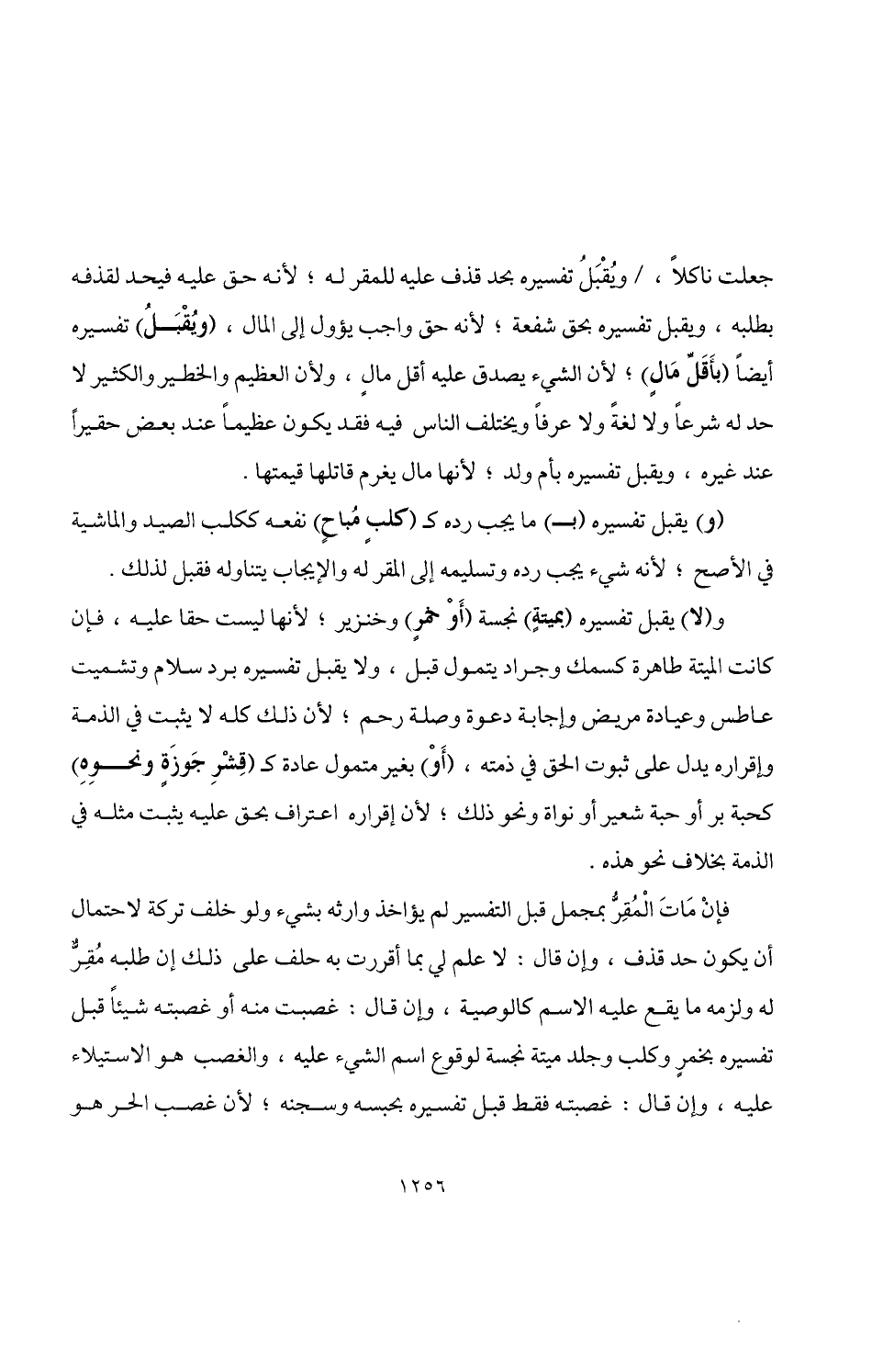 جعلت ناكلًا، ويُقْبَلُ تفسيره بحد قذف عليه للمقر له؛ لأنه حق عليه فيحد لقذفه بطلبه، ويقبل تفسيره بحق شفعة؛ لأنه حق واجب يؤول إلى المال، (ويُقْبَلُ) تفسيره أيضًا (بأَقَلِّ مَالٍ)؛ لأن الشيء يصدق عليه أقل مالٍ، ولأن العظيم والخطير والكثير لا حد له شرعًا ولا لغةً ولا عرفًا ويختلف الناس فيه فقد يكون عظيمًا عند بعض حقيرًا عند غيره، ويقبل تفسيره بأم ولد؛ لأنها مال يغرم قاتلها قيمتها.