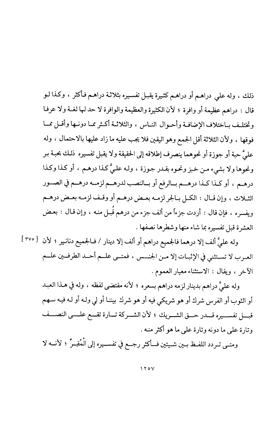 ذلك، وله علي دراهم أو دراهم كثيرة يقبل تفسيره بثلاثة دراهم فأكثر، وكذا لو قال: دراهم عظيمة أو وافرة؛ لأن الكثيرة والعظيمة والوافرة لا حد لها لغة ولا عرفا وتختلف باختلاف الإضافة وأحوال الناس، والثلاثة أكثر مما دونها وأقل مما فوقها, ولأن الثلاثة أقل الجمع وهو اليقين فلا يجب عليه ما زاد عليها بالاحتمال، وله عليَّ حبة أو جوزة أو نحوهما ينصرف إطلاقه إلى الحقيقة ولا يقبل تفسيره ذلك بحبة بر ونحوها ولا بشيء من خبز ونحوه بقدر جوزة، وله عليَّ كذا درهم، أو كذا وكذا درهم، أو كذا كذا درهم بالرفع أو بالنصب لدرهم لزمه درهم في الصور الثلاث، وإن قال: الكل بالجر لزمه بعض درهم أو وقف لزمه بعض درهم ويفسره، فإن قال: أردت جزءًا من ألف جزء من درهم قُبل منه، وإن قال: بعض العشرة قبل تفسيره بما شاء منها وشطرها نصفها.