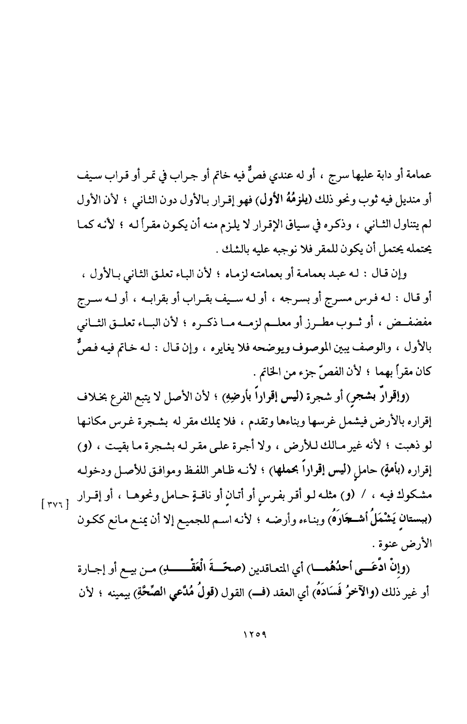 (وإقرارٌ بشجرٍ) أو شجرة (ليس إقرارًا بأرضِهِ)؛ لأن الأصل لا يتبع الفرع بخلاف إقراره بالأرض فيشمل غرسها وبناءها وتقدم، فلا يملك مقر له بشجرة غرس مكانها لو ذهبت؛ لأنه غير مالك للأرض، ولا أجرة على مقر له بشجرة ما بقيت، (و) إقراره (بأمةٍ) حاملٍ (ليس إقرارًا بحملها)؛ لأنه ظاهر اللفظ وموافق للأصل ودخوله مشكوك فيه، (و) مثله لو أقر بفرسٍ أو أتانٍ أو ناقةٍ حامل ونحوها، أو إقرار (ببستانٍ يَشْمَلُ أشجَارَهُ) وبناءه وأرضه؛ لأنه اسم للجميع إلا أن يمنع مانع ككون الأرض عنوة.