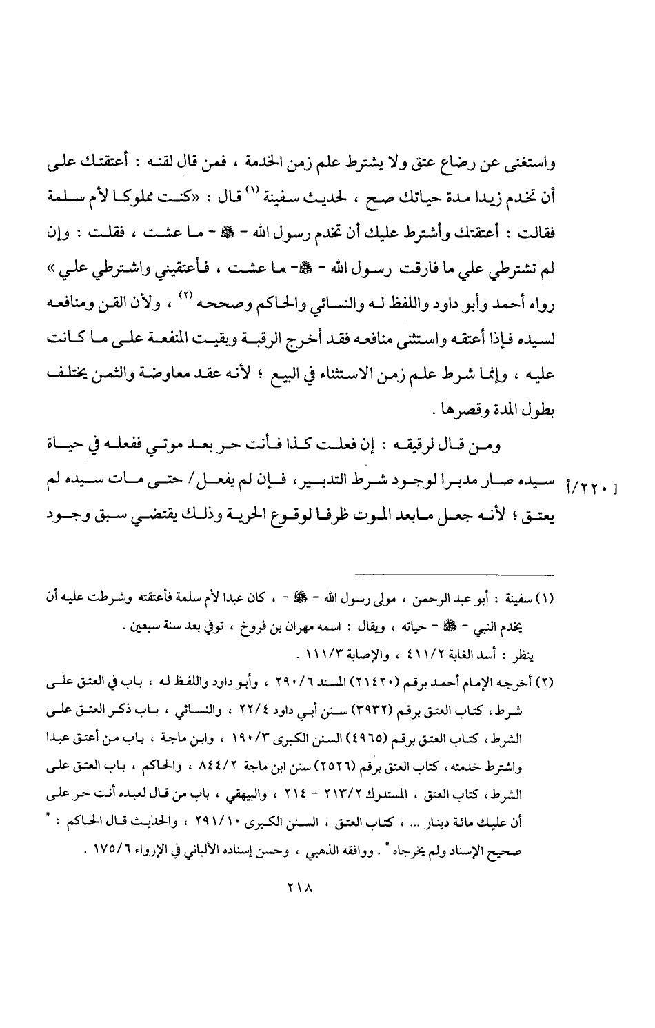 (¬2) أخرجه الإمام أحمد برقم (21420) المسند 6/ 290، وأبو داود واللفظ له، باب في العتق على شرط، كتاب العتق برقم (3932) سنن أبي داود 4/ 22، والنسائي، باب ذكر العتق على الشرط، كتاب العتق برقم (4965) السنن الكبرى 3/ 190، وابن ماجة، باب من أعتق عبدا واشترط خدمته، كتاب العتق برقم (2526) سنن ابن ماجة 2/ 844، والحاكم، باب العتق على الشرط، كتاب العتق، المستدرك 2/ 213 - 214، والبيهقي، باب من قال لعبده أنت حر على أن عليك مائة دينار. . .، كتاب العتق، السنن الكبرى 10/ 291، والحديث قال الحاكم: "صحيح الإسناد ولم يخرجاه". ووافقه الذهبي، وحسن إسناده الألباني في الإرواء 6/ 175.