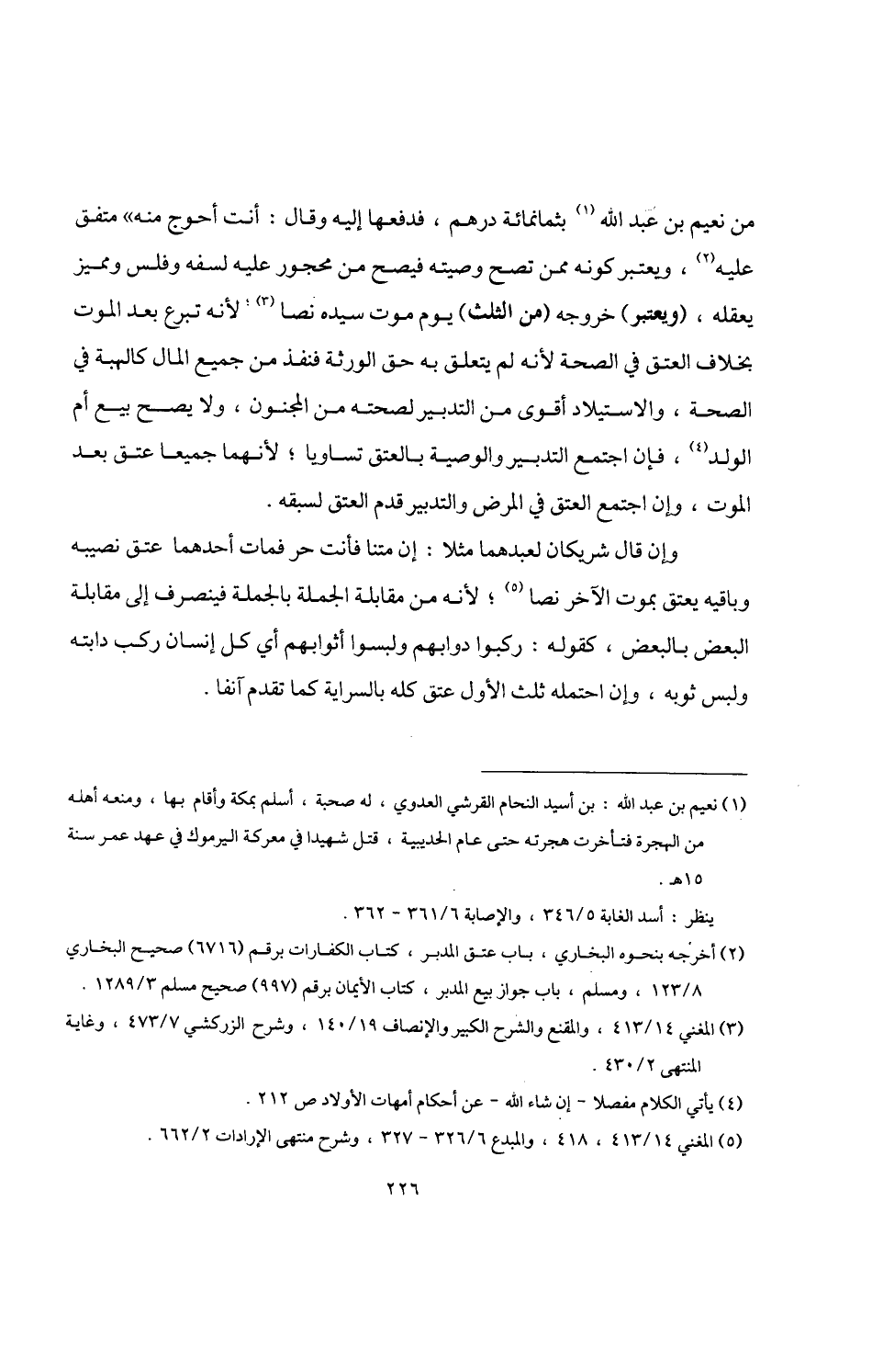 من نعيم بن عبد اللَّه (¬1) بثمانمائة درهم، فدفعها إليه وقال: أنت أحوج منه" متفق عليه (¬2)، ويعتبر كونه ممن تصح وصيته فيصح من محجور عليه لسفه وفلس ومميز يعقله، (ويعتبر) خروجه (من الثلث) يوم مصت سيده نصا (¬3)؛ لأنه تبرع بعد الموت بخلاف العتق في الصحة لأنه لم يتعلق به حق الورثة فنفذ من جميع المال كالهبة في الصحة، والاستيلاد أقوى من التدبير لصحته من المجنون، ولا يصح بيع أم الولد (¬4)، فإن اجتمع التدبير والوصية بالعتق تساويا؛ لأنهما جميعا عتق بعد الموت، وإن اجتمع العتق في المرض والتدبير قدم العتق لسبقه.
