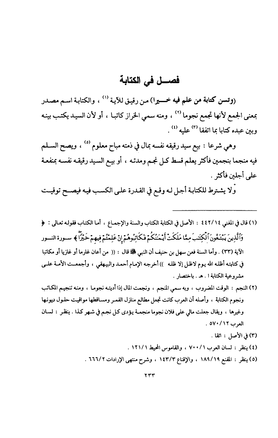 (¬1) قال في المغني 14/ 442: الأصل في الكتابة الكتاب والسنة والإجماع، أما الكتاب فقوله تعالى: {وَالَّذِينَ يَبْتَغُونَ الْكِتَابَ مِمَّا مَلَكَتْ أَيْمَانُكُمْ فَكَاتِبُوهُمْ إِنْ عَلِمْتُمْ فِيهِمْ خَيْرًا} سورة النور الآية (33). وأما السنة فعن سهل بن حنيف أن النبي -صلى اللَّه عليه وسلم- قال: "من أعان غارما أو غازيا أو مكاتبا في كتابته أظله اللَّه يوم لا ظل إلا ظله" أخرجه الإمام أحمد والبيهقي، وأجمعت الأمة على مشروعية الكتابة ا. هـ. باختصار.