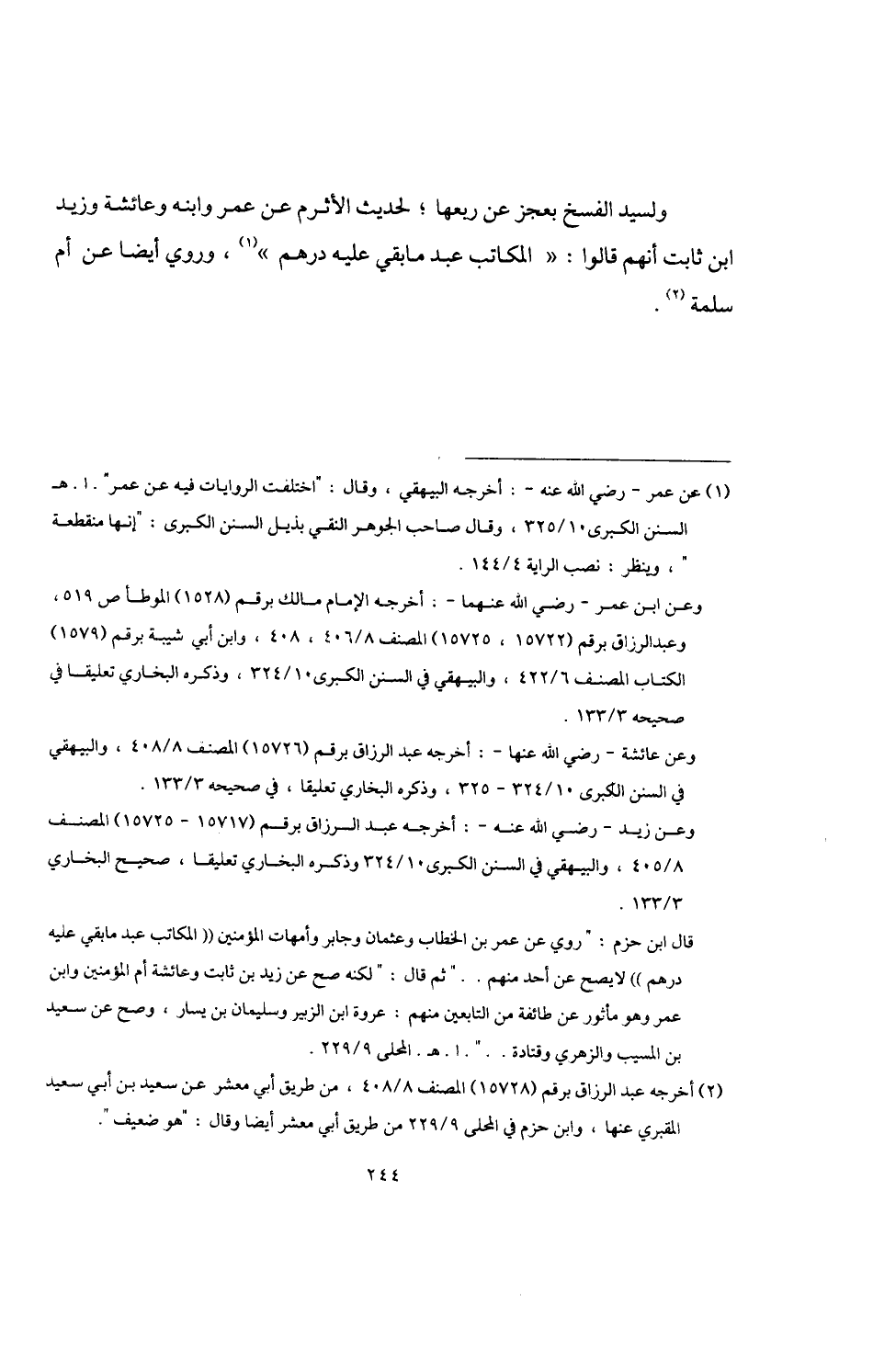قال ابن حزم: "روي عن عمر بن الخطاب وعثمان وجابر وأمهات المؤمنين "المكاتب عبد ما بقي عميه درهم" لا يصح عن أحد منهم. . " ثم قال: "لكنه صح عن زيد بن ثابت وعائشة أم المؤمنين وابن عمر وهو مأثور عن طائفة من التابعين منهم: عروة ابن الزبير وسليمان بن يسار، وصح عن سعيد بن المسيب والزهري وقتادة. . ". ا. هـ. المحلى 9/ 229.