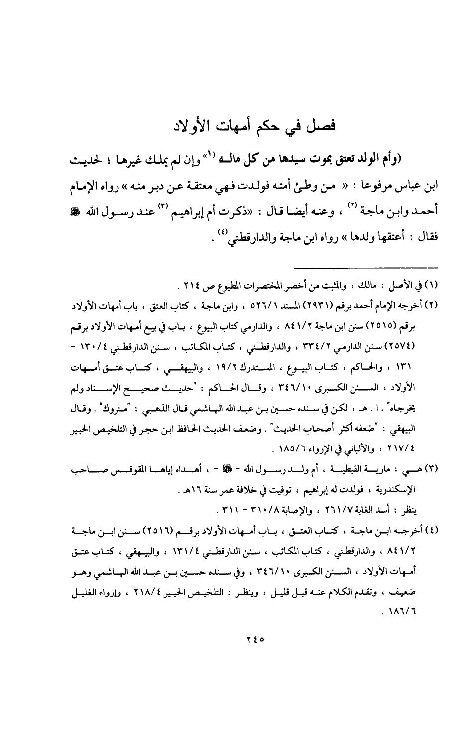 (¬2) أخرجه الإمام أحمد برقم (2931) المسند 1/ 526، وابن ماجة، كتاب العتق، باب أمهات الأولاد برقم (2515) سنن ابن ماجة 2/ 841، والدارمي كتاب البيوع، باب في بيع أمهات الأولاد برقم (2574) سنن الدارمي 2/ 334، والدارقطني، كتاب المكاتب، سنن الدارقطني 4/ 130 - 131، والحاكم، كتاب البيوع، المستدرك 2/ 19، والبيهقي، كتاب عتق أمهات الأولاد، السنن الكبرى 10/ 346، وقال الحاكم: "حديث صحيح الإسناد ولم يخرجاه" ا. هـ، لكن في سنده حسين بن عبد اللَّه الهاشمي قال الذهبي: "متروك". وقال البيهقي: "ضعفه أكثر أصحاب الحديث". وضعف الحديث الحافظ ابن حجر في التلخيص الحبير 4/ 217، والألباني في الإرواء 6/ 185.