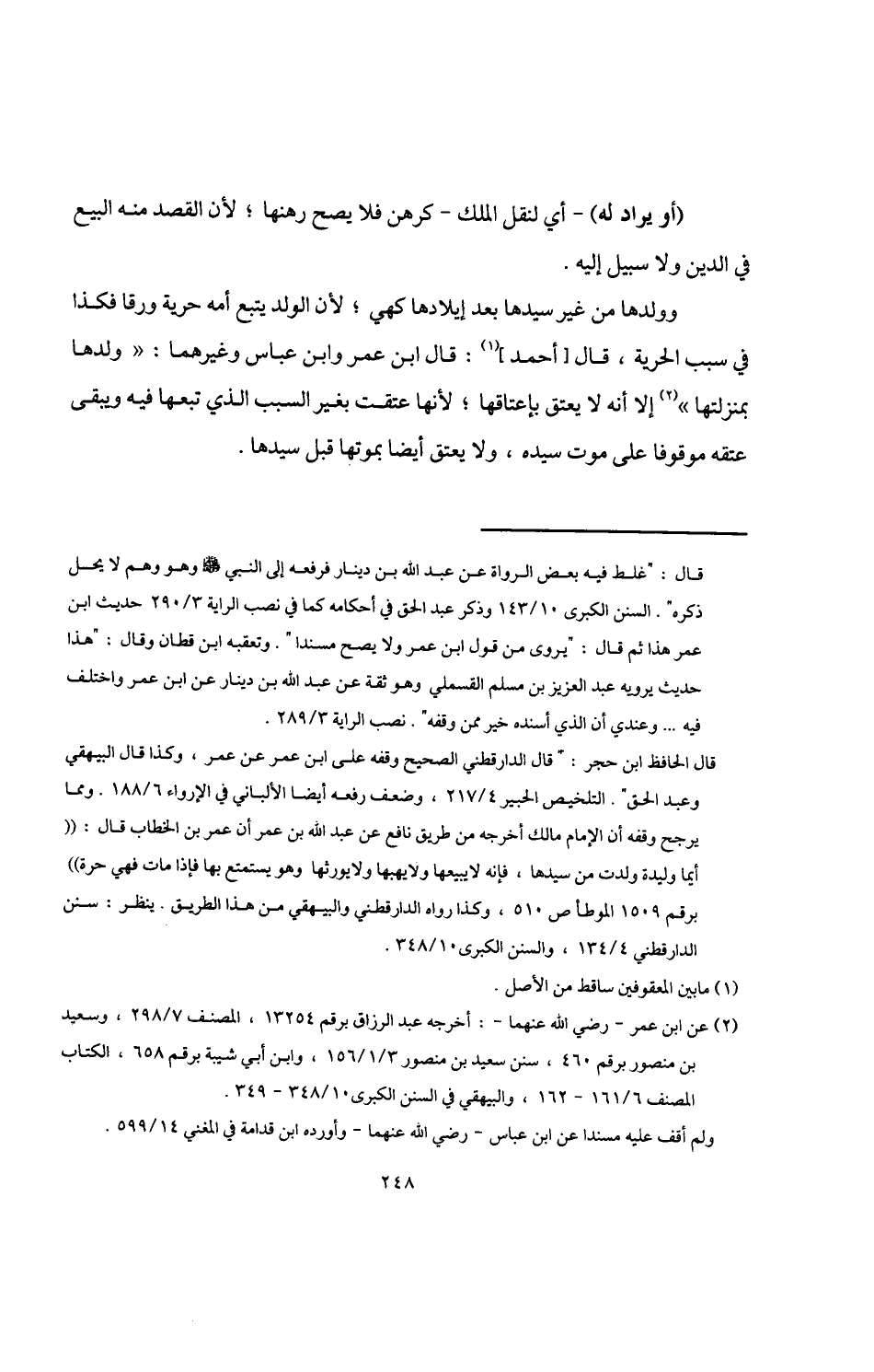 قال الحافظ ابن حجر: قال الدارقطني الصحيح وقفه على ابن عمر عن عمر، وكذا قال البيهقي وعبد الحق". التلخيص الحبير 4/ 217، وضعف رفعه أيضا الألباني في الإرواء 6/ 188. ومما يرجح وقفه أن الإمام مالك أخرجه من طريق نافع عن عبد اللَّه بن عمر أن عمر بن الخطاب قال: "أيما وليدة ولدت من سيدها، فإنه لا يبيعها ولا يهبها ولا يورثها وهو يستمتع بها فإذا مات فهي حرة" برقم 1509 الموطأ ص 510، وكذا رواه الدارقطني والبيهقي من هذا الطريق. ينظر: سنن الدارقطني 4/ 134، والسنن الكبرى 10/ 348.