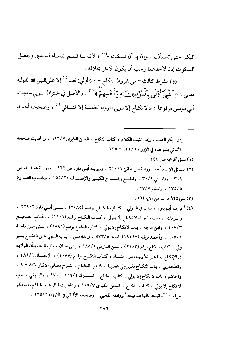 (¬4) أخرجه أبو داود، باب في الولي، كتاب النكاح برقم (2085)، سنن أبي داود 2/ 229، والترمذي، باب ما جاء لا نكاح إلا بولي، كتاب النكاح برقم (1101)، الجامع الصحيح 3/ 407، وابن ماجة، باب لا نكاح إلا بولي، كتاب النكاح برقم (1881)، سنن ابن ماجة 1/ 605، وأحمد برقم (19247) المسند 5/ 573، والدارمي، باب النهي عن النكاح بغير ولي، كتاب النكاح برقم (2183)، سنن الدارمي 2/ 185، وابن حبان، باب البيان بأن الولاية في الإنكاح إنما هي للأولياء دون النساء، كتاب النكاح برقم (4077)، الإحسان 9/ 389، والطحاوي، باب النكاح بغير ولي عصبة، كتاب النكاح، شرح معاني الآثار 3/ 8 - 9، والحاكم، باب لا نكاح إلا بولي، كتاب النكاح، المستدرك 2/ 169 - 170، والبيهقي، باب لا نكاح إلا بولي، كتاب النكاح، السنن الكبرى 7/ 109، والحديث قال عنه الحاكم بعد ذكر طرقه: "أسانيدها كلها صحيحة" ووافقه الذهبي، وصححه الألباني في الإرواء 6/ 235.