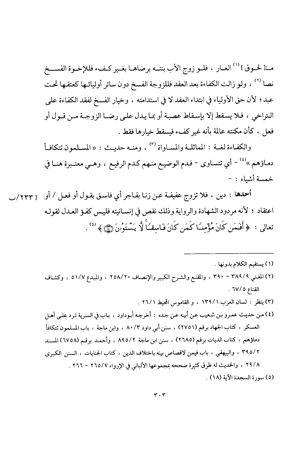أحدها: دين، فلا تزوج عفيفة عن زنا بفاجر أي فاسق بقول أو فعل أو اعتقاد؛ لأنه مردود الشهادة والرواية وذلك نقص في إنسانيته فليس كفؤ العدل لقوله تعالى: {أَفَمَنْ كَانَ مُؤْمِنًا كَمَنْ كَانَ فَاسِقًا لَا يَسْتَوُونَ (18)} (¬5).