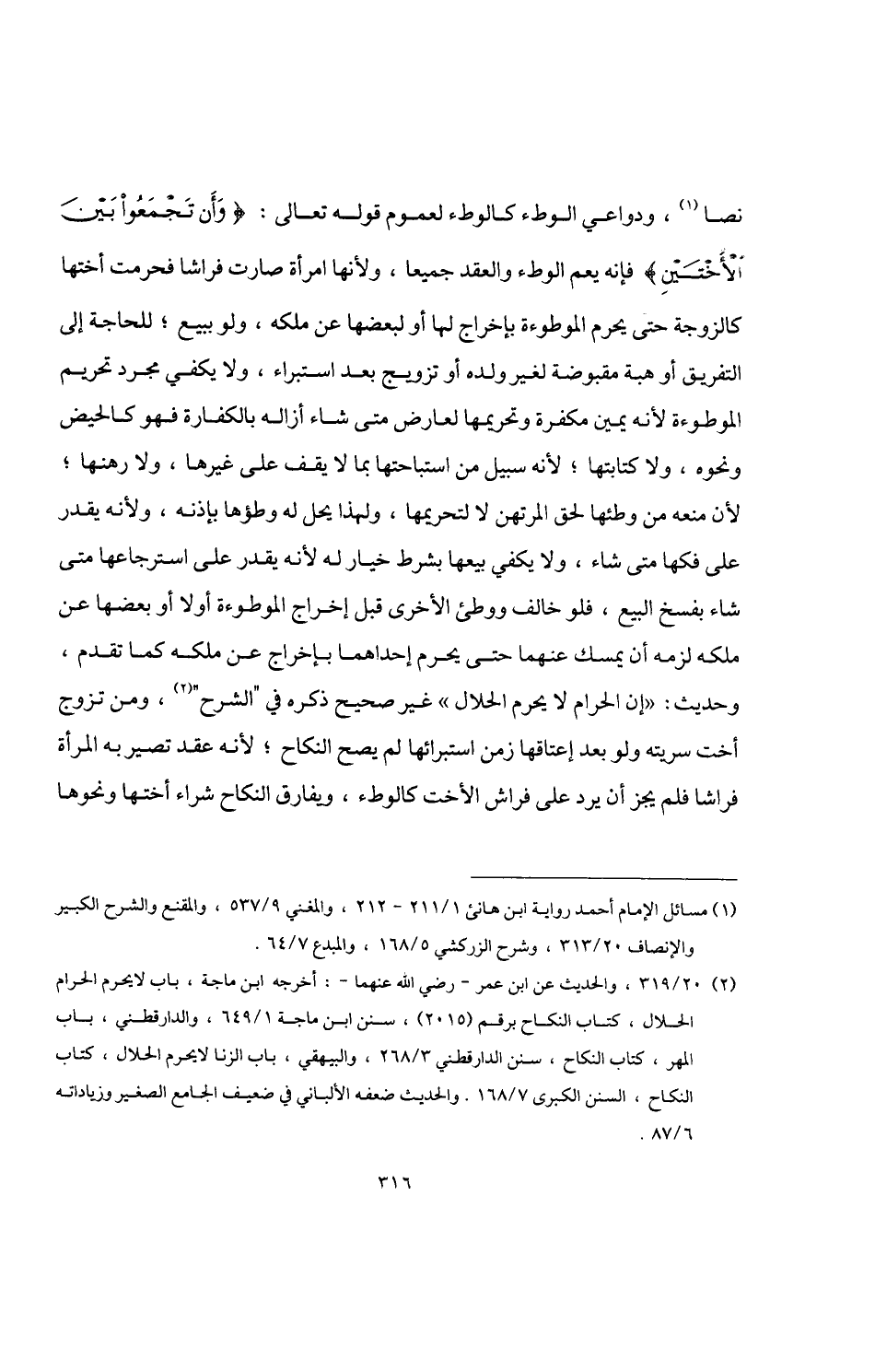 نصا (¬1)، ودواعي الوطء كالوطء لعموم قوله تعالى: {وَأَنْ تَجْمَعُوا بَيْنَ الْأُخْتَيْنِ} فإنه يعم الوطء والعقد جميعا، ولأنها امرأة صارت فراشا فحرمت أختها كالزوجة حتى يحرم الموطوءة بإخراج لها أو لبعضها عن ملكه، ولو ببيع؛ للحاجة إلى التفريق أو هبة مقبوضة لغير ولده أو تزويج بعد استبراء، ولا يكفي مجرد تحريم الموطوءة لأنه يمين مكفرة وتحريمها لعارض متى شاء أزاله بالكفارة فهو كالحيض ونحوه، ولا كتابتها؛ لأنه سبيل من استباحتها بما لا يقف على غيرها، ولا رهنها؛ لأن منعه من وطئها لحق المرتهن لا لتحريمها، ولهذا يحل له وطؤها بإذنه، ولأنه يقدر على فكها متى شاء، ولا يكفي بيعها بشرط خيار له لأنه يقدر على استرجاعها متى شاء بفسخ البيع، فلو خالف ووطئ الأخرى قبل إخراج الموطوءة أولا أو بعضها عن ملكه لزمه أن يمسك عنهما حتى يحرم إحداهما بإخراج عن ملكه كما تقدم، وحديث: "إن الحرام لا يحرم الحلال" غير صحيح ذكره في "الشرح" (¬2)، ومن تزوج أخت سريته ولو بعد إعتاقها زمن استبرائها لم يصح النكاح؛ لأنه عقد تصير به المرأة فراشا فلم يجز أن يرد على فراش الأخت كالوطء، ويفارق النكاح شراء أختها ونحوها