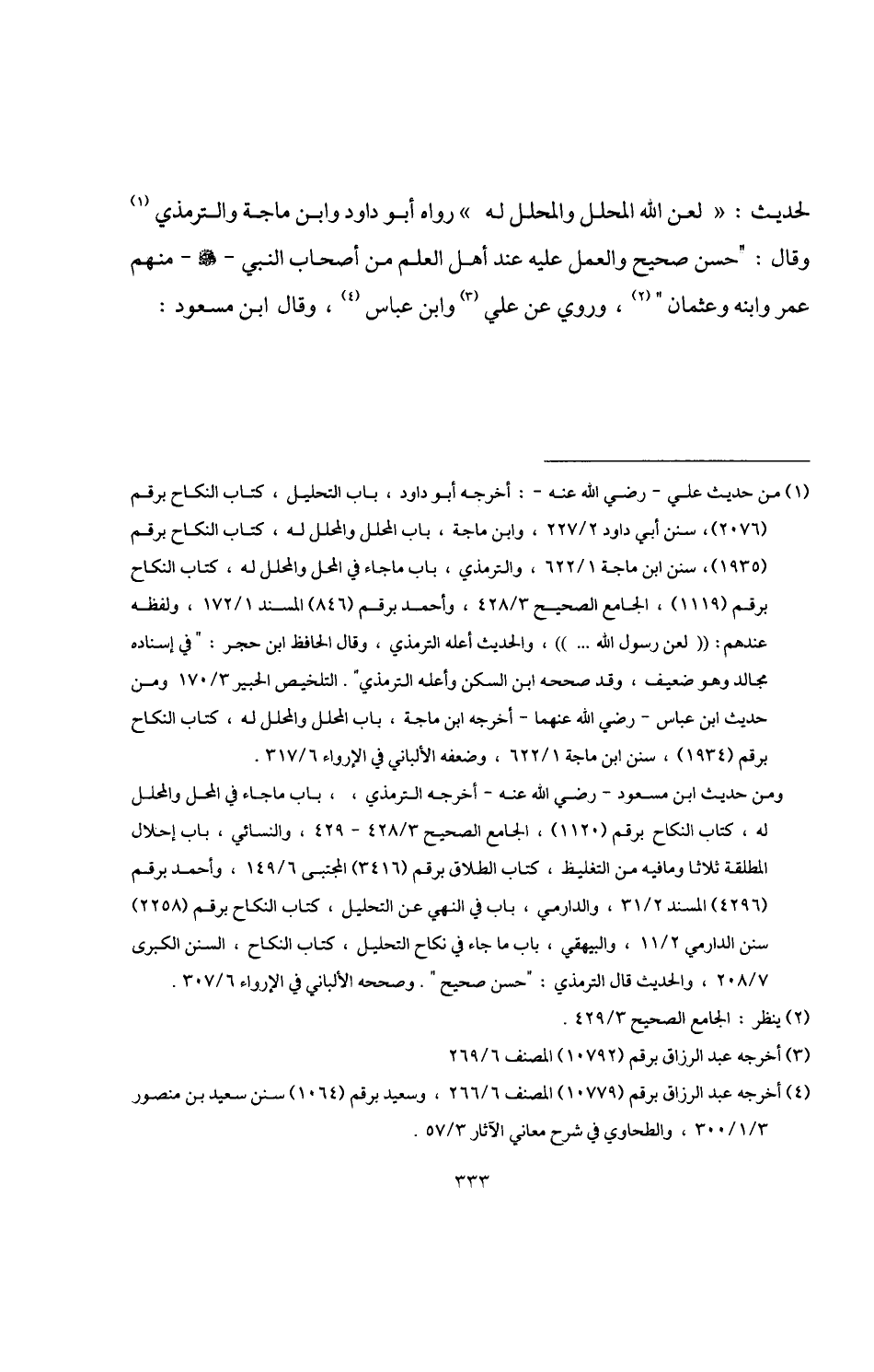 (¬1) من حديث علي -رضي اللَّه عنه-: أخرجه أبو داود، باب التحليل، كتاب النكاح برقم (2076)، سنن أبي داود 2/ 227، وابن ماجة، باب المحلل والمحلل له، كتاب النكاح برقم (1935)، سنن ابن ماجة 1/ 622، والترمذي، باب ما جاء في المحل والمحلل له، كتاب النكاح برقم (1119)، الجامع الصحيح 3/ 428، وأحمد برقم (846) المسند 1/ 172، ولفظه عندهم: "لعن رسول اللَّه. . . "، والحديث أعله الترمذي، وقال الحافظ ابن حجر: "في إسناده مجالد وهو ضعيف، وقد صححه ابن السكن وأعله الترمذي". التلخيص الحبير 3/ 170 ومن حديث ابن عباس -رضي اللَّه عنهما- أخرجه ابن ماجة، باب المحلل والمحلل له، كتاب النكاح برقم (1934)، سنن ابن ماجة 1/ 622، وضعفه الألباني في الإرواء 6/ 317.