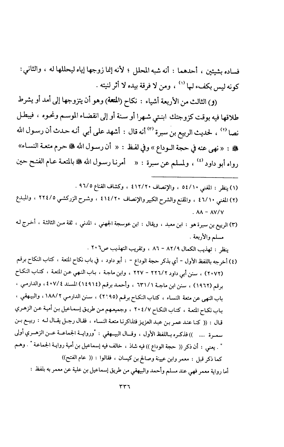 (و) الثالث من الأربعة أشياء: نكاح (المتعة) وهو أن يتزوجها إلى أمد أو يشرط طلاقها فيه بوقت كزوجتك ابنتي شهرا أو سنة أو إلى انقضاء الموسم ونحوه، فيبطل نصا (¬2)، لحديث الربيع بن سبرة (¬3) أنه قال: أشهد على أبي أنه حدث أن رسول اللَّه -صلى اللَّه عليه وسلم-: "نهى عنه في حجة الوداع" وفي لفظ: "أن رسول اللَّه -صلى اللَّه عليه وسلم- حرم متعة النساء" رواه أبو داود (¬4)، ولمسلم عن سبرة: "أمرنا رسول اللَّه -صلى اللَّه عليه وسلم- بالمتعة عام الفتح حين