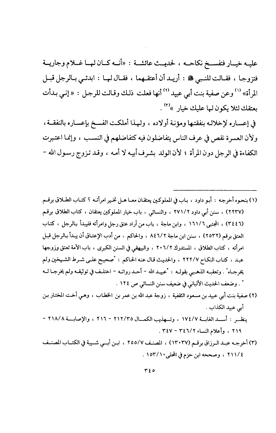 (¬1) بنحوه أخرجه: أبو داود، باب في المملوكين يعتقان معا هل تخير امرأته؟ كتاب الطلاق برقم (2237)، سنن أبي داود 2/ 271، والنسائي، باب خيار المملوكين يعتقان، كتاب الطلاق برقم (3446)، المجتبى 6/ 161، وابن ماجة، باب من أراد عتق رجل وامرأته فليبدأ بالرجل، كتاب العتق برقم (2532)، سنن ابن ماجة 2/ 846، والحاكم، من أدب الإعتاق أن يبدأ بالرجل قبل امرأته، كتاب الطلاق، المستدرك 2/ 206، والبيهقي في السنن الكبرى، باب الأمة تعتق وزوجها عبد، كتاب النكاح 7/ 222، والحديث قال عنه الحاكم: "صحيح على شرط الشيخين ولم يخرجاه". وتعقبه النصبي بقوله: "عبيد اللَّه -أحد رواته- اختلف في توثيقه ولم يخرجا له". وضعف الحديث الألباني في ضعيف سنن النسائي ص 124.