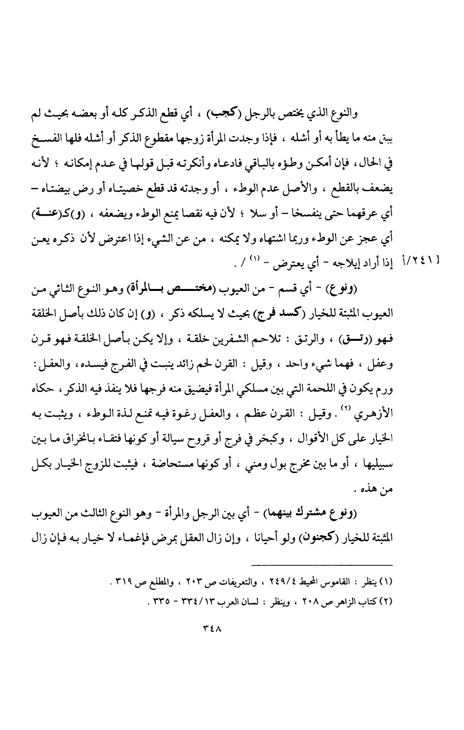 (ونوع) -أي قسم- من العيوب (مختص بالمرأة) وهو النوع الثاني من العيوب المثبتة للخيار (كسد فرج) بحيث لا يسلكه ذكر، (و) إن كان ذلك بأصل الخلقة فهو (رتق)، والرتق: تلاحم الشفرين خلقة، وإلا يكن بأصل الخلقة فهو قرن وعفل، فهما شيء واحد، وقيل: القرن لحم زائد ينبت في الفرج فيسده، والعفل: ورم يكون في اللحمة التي بين مسلكي المرأة فيضيق منه فرجها فلا ينفذ فيه الذكر، حكاه الأزهري (¬2). وقيل: القرن عظم، والعفل رغوة فيه تمنع لذة الوطء، ويثبت به الخيار على كل الأقوال، وكبخر في فرج أو قروح سيالة أو كونها فتقاء بانخراق ما بين سبيليها، أو ما بين مخرج بول ومني، أو كونها مستحاضة، فيثبت للزوج الخيار بكل من هذه.