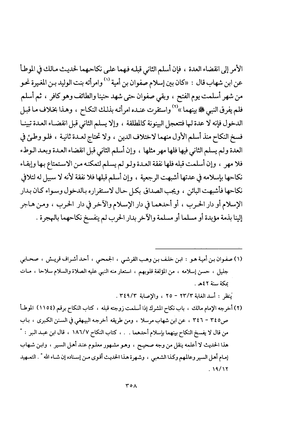 (¬2) أخرجه الإمام مالك، باب نكاح المشرك إذا أسلمت زوجته قبله، كتاب النكاح برقم (1154) الموطأ ص 345 - 346، عن ابن شهاب مرسلا، ومن طريقه أخرجه البيهقي في السنن الكبرى، باب من قال لا يفسخ النكاح بينهما بإسلام أحدهما. .، كتاب النكاح 7/ 186، قال ابن عبد البر: "هذا الحديث لا أعلمه ينقل من وجه صحيح، وهو مشهور معلوم عند أهل السير، وابن شهاب إمام أهل السير وعالمهم وكذا الشعبي، وشهرة هذا الحديث أقوى من إسناده إن شاء اللَّه". التمهيد 12/ 19.