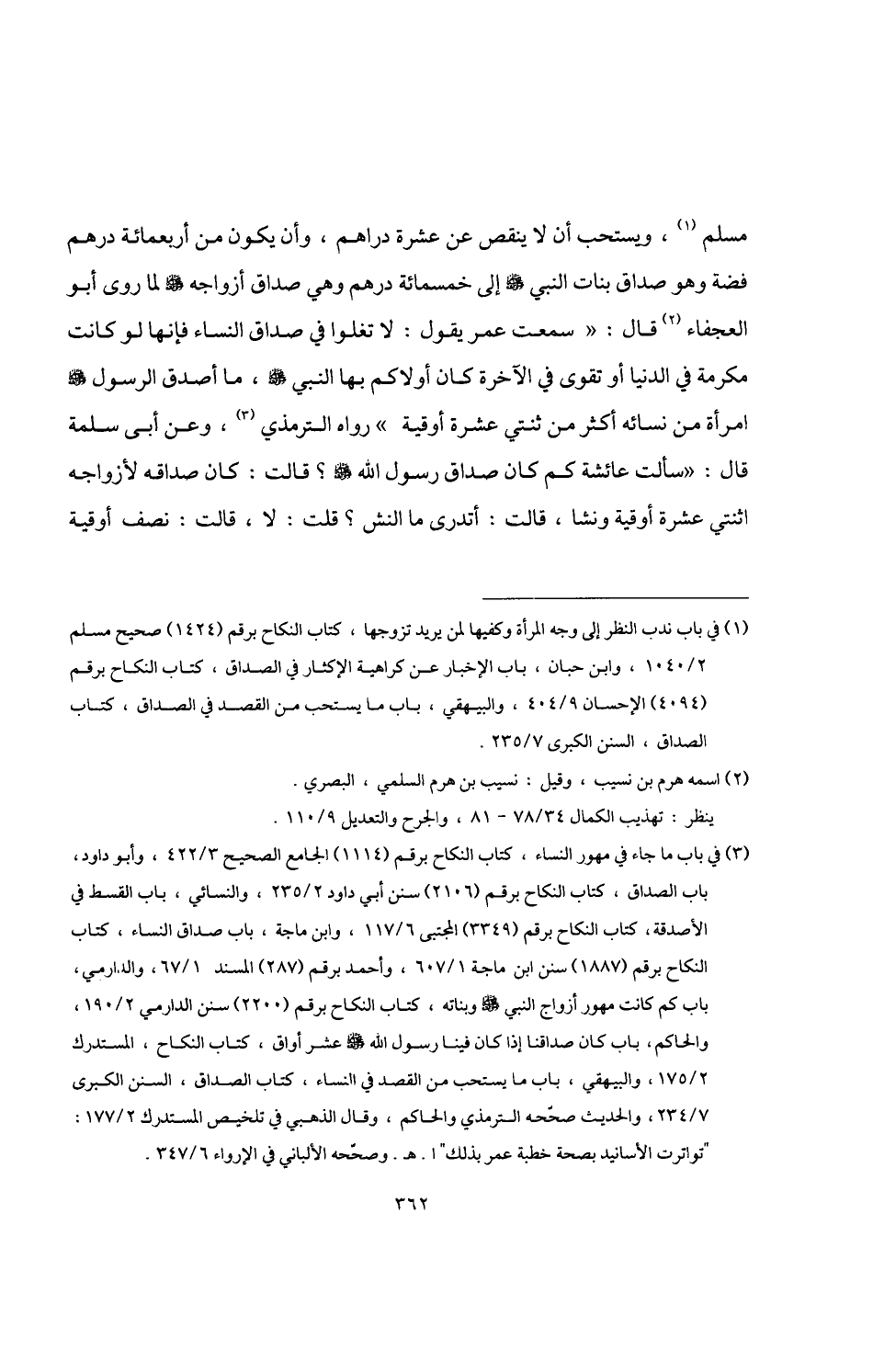 (¬3) في باب ما جاء في مهور النساء، كتاب النكاح برقم (1114) الجامع الصحيح 3/ 422، وأبو داود، باب الصداق، كتاب النكاح برقم (2106) سنن أبي داود 2/ 235، والنسائي، باب القسط في الأصدقة، كتاب النكاح برقم (3349) المجتبى 6/ 117، وابن ماجة، باب صداق النساء، كتاب النكاح برقم (1887) سنن ابن ماجة 7/ 601، وأحمد برقم (287) المسند 1/ 67، والدارمي، باب كم كانت مهور أزواج النبي -صلى اللَّه عليه وسلم- وبناته، كتاب النكاح برقم (2200) سنن الدارمي 2/ 190، والحاكم، باب كان صداقنا إذا كان فينا رسول اللَّه -صلى اللَّه عليه وسلم- عشر أواق، كتاب النكاح، المستدرك 2/ 175، والبيهقي، باب ما يستحب من القصد في النساء، كتاب الصداق، السنن الكبرى 7/ 234، والحديث صحّحه الترمذي والحاكم، وقال الذهبي في تلخيص المستدرك 2/ 177: "تواترت الأسانيد بصحة خطبة عمر بذلك" ا. هـ. وصحّحه الألباني في الإرواء 6/ 347.