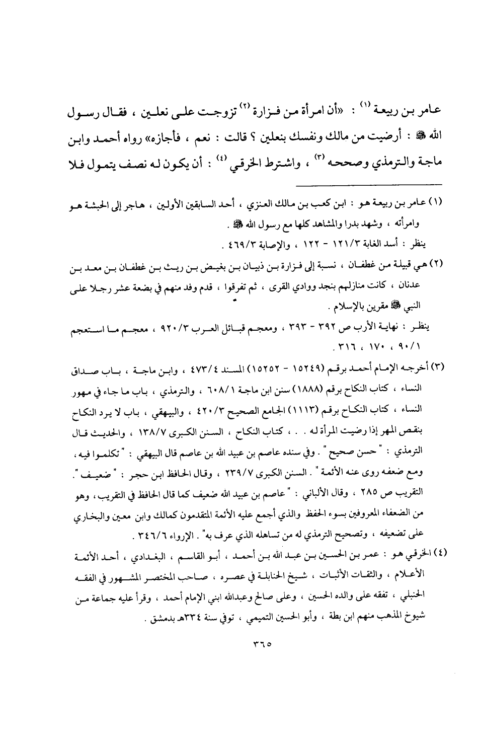 (¬3) أخرجه الإمام أحمد برقم (15249 - 15252) المسند 4/ 473، وابن ماجة، باب صداق النساء، كتاب النكاح برقم (1888) سنن ابن ماجة 8/ 601، والترمذي، باب ما جاء في مهور النساء، كتاب النكاح برقم (1113) الجامع الصحيح 3/ 420، والبيهقي، باب لا يرد النكاح بنقص المهر إذا رضيت المرأة له. .، كتاب النكاح، السنن الكبرى 7/ 138، والحديث قال الترمذي: "حسن صحيح". وفي سنده عاصم بن عبيد اللَّه بن عاصم قال البيهقي: "تكلموا فيه، ومع ضعفه روى عنه الأئمة". السنن الكبرى 7/ 239، وقال الحافظ ابن حجر: "ضعيف". التقريب ص 285، وقال الألباني: "عاصم بن عبيد اللَّه ضعيف كما قال الحافظ في التقريب، وهو من الضعفاء المعروفين بسوء الحفظ والذي أجمع عليه الأئمة المتقدمون كمالك وابن معين والبخاري على تضعيفه، وتصحيح الترمذي له من تساهله الذي عرف به". الإرواء 6/ 346.